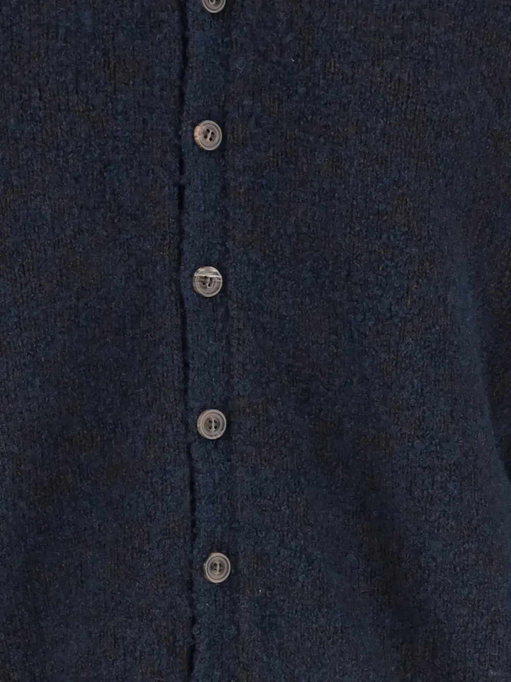 Темно-синяя шерстяная смесовая модель с V-образным вырезом, застежкой на пуговицы, длинными рукавами и ребристыми отделками