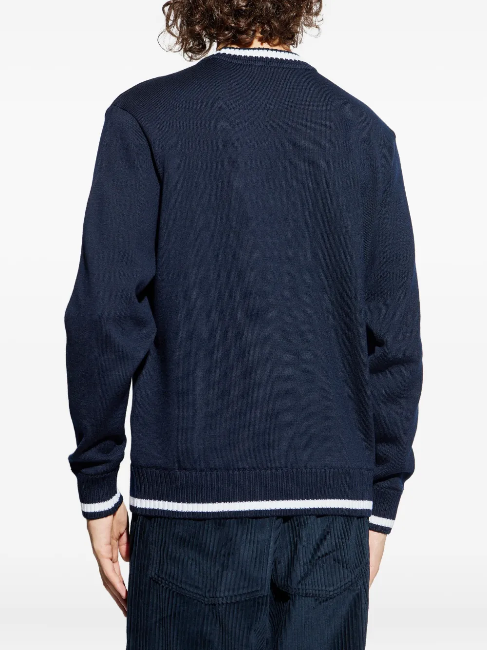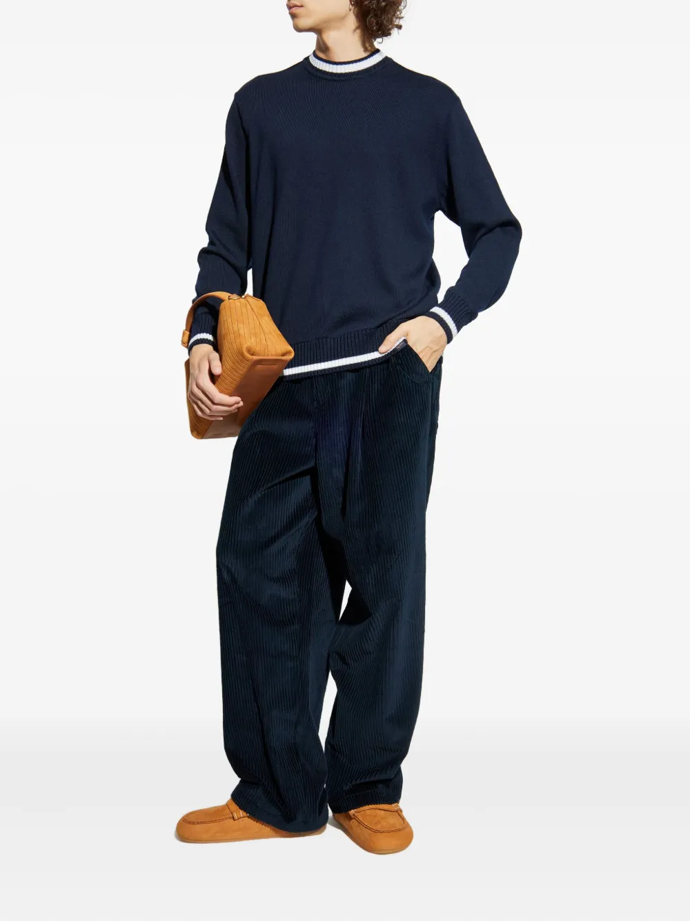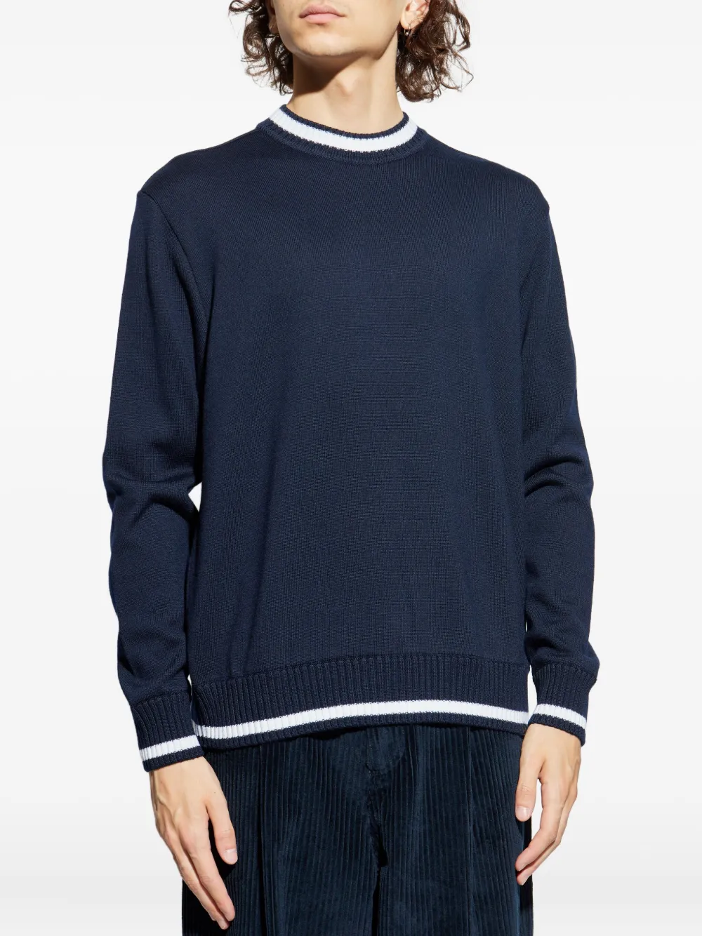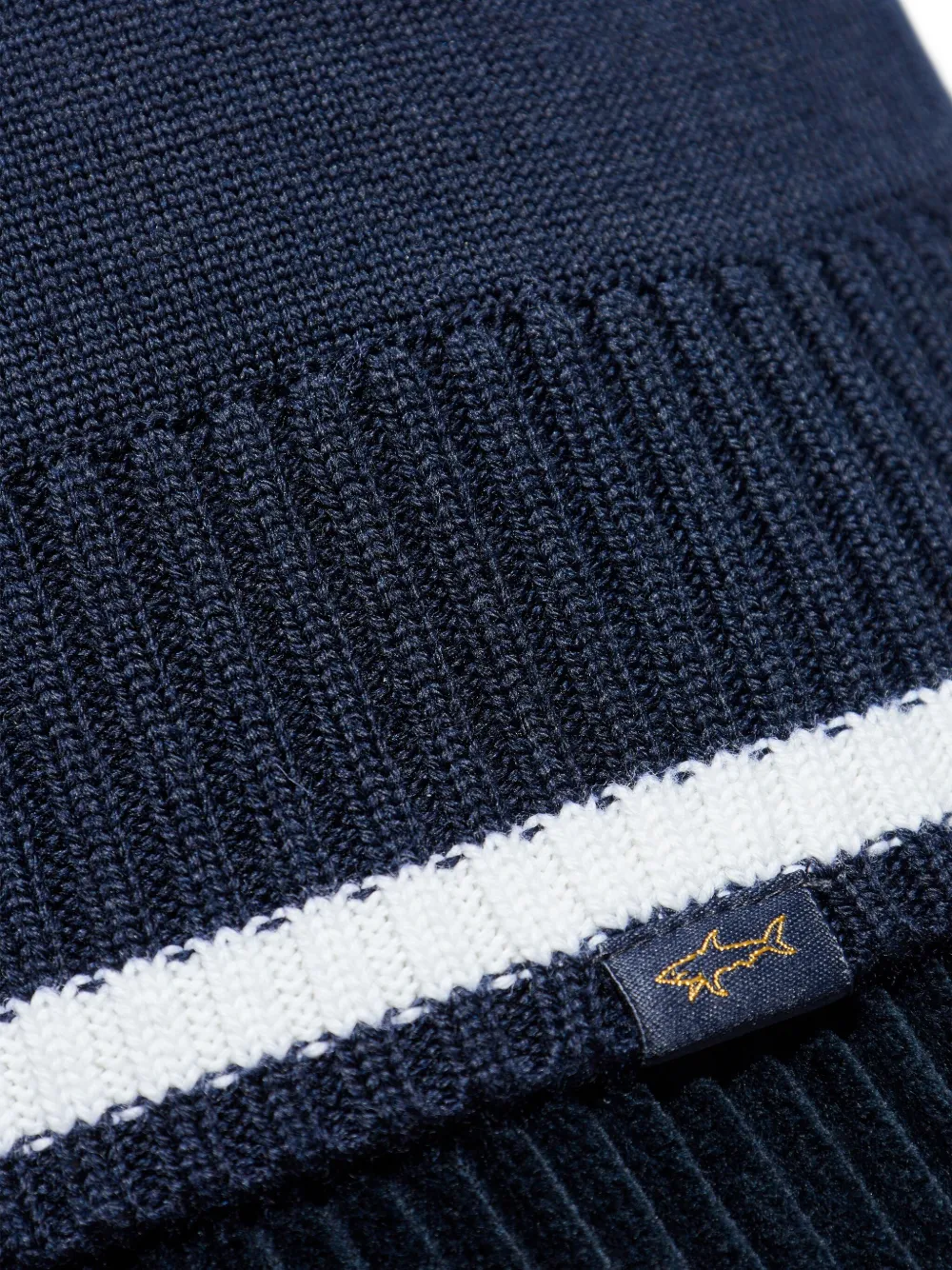 Темно-синий шерстяной ребристый подол, ребристые манжеты, круглый вырез горловины, белые полосы