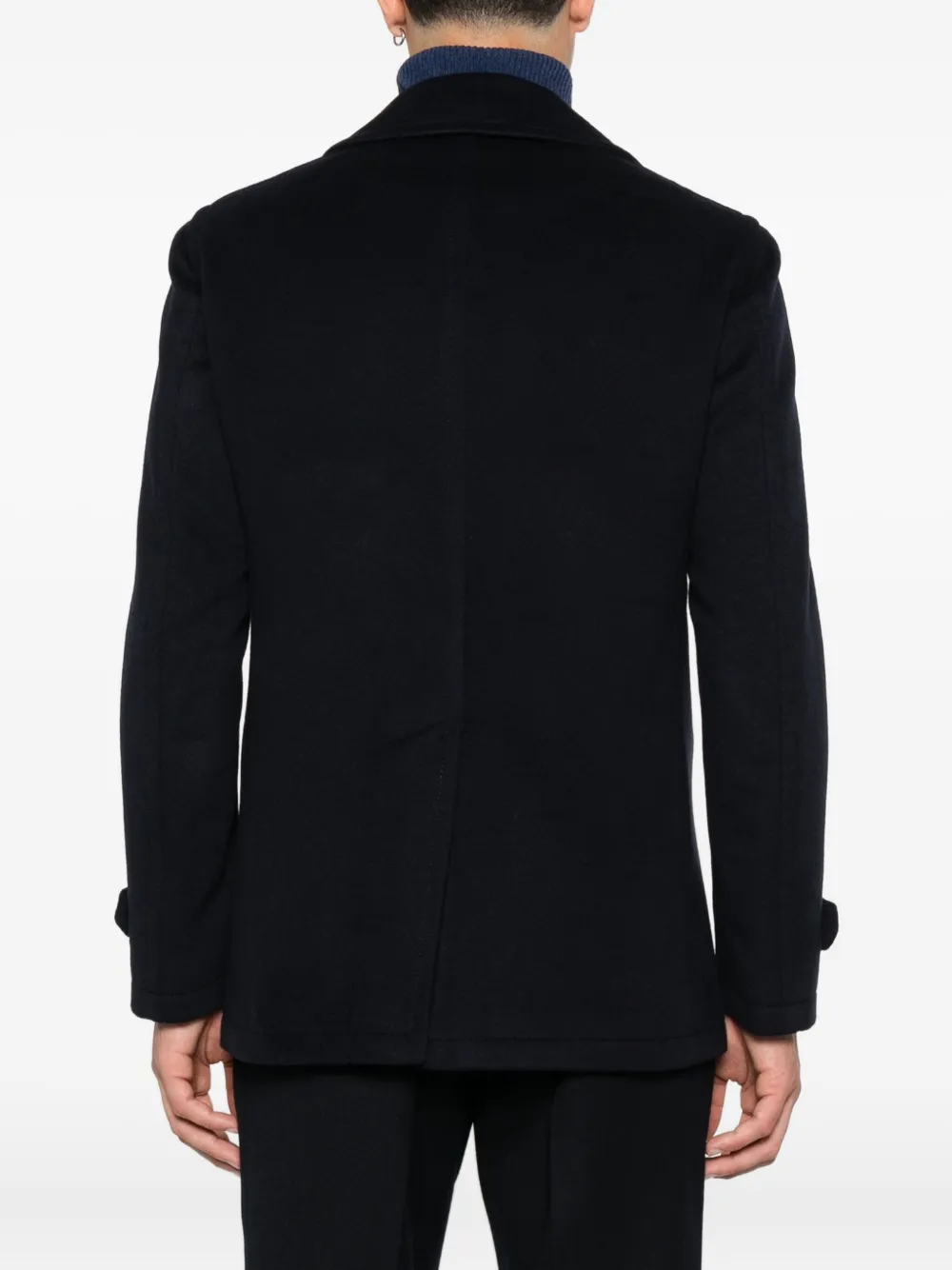 Темно-синий двубортный пиджак, застежка с зазубренными лацканами, длинные рукава, застегивающиеся на пуговицы манжеты, прорезные карманы