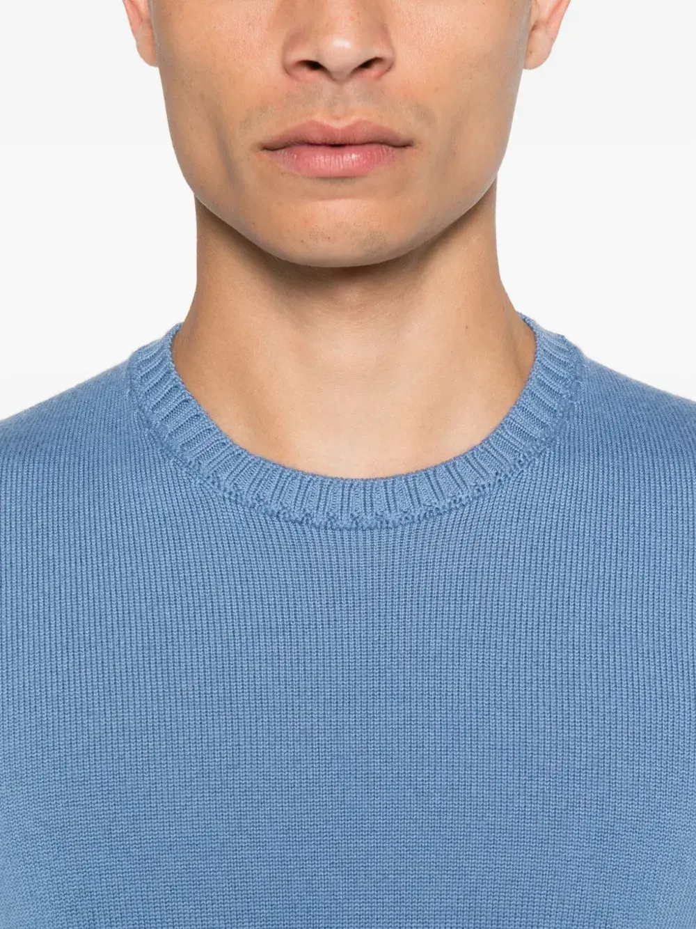 Джинсовая ткань синего цвета из мериносовой шерсти, круглый вырез горловины, длинные рукава, ребристые манжеты, ребристый подол