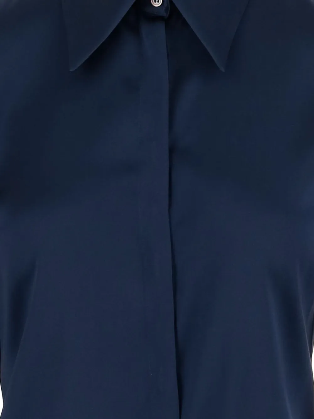 Темно-синий заостренный воротник, длинные рукава, застегивающиеся на пуговицы манжеты, потайная застежка на пуговицы, закругленный подол