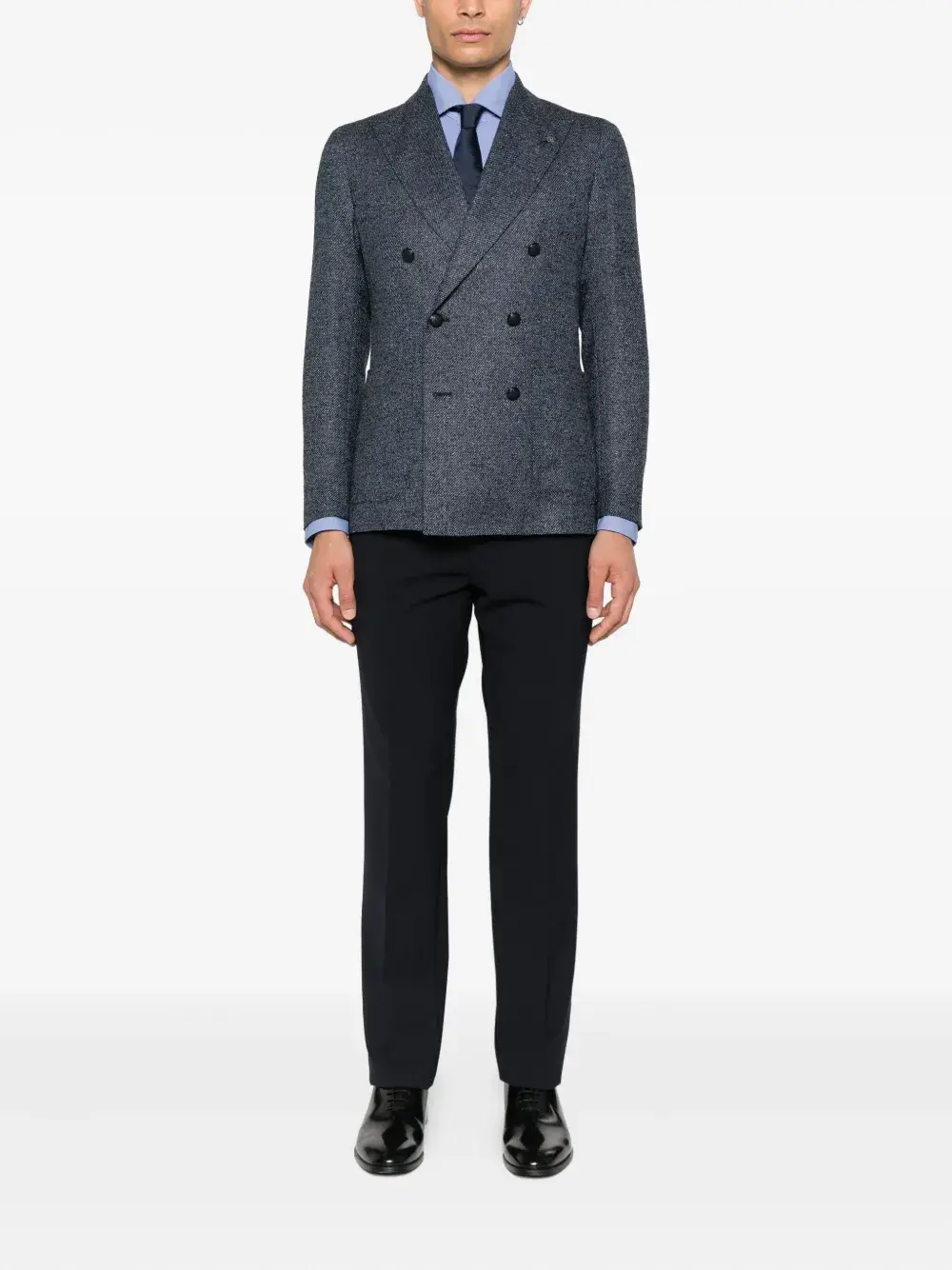 Синие длинные рукава, застежка на пуговицы спереди, закругленный подол, манжеты на пуговицах