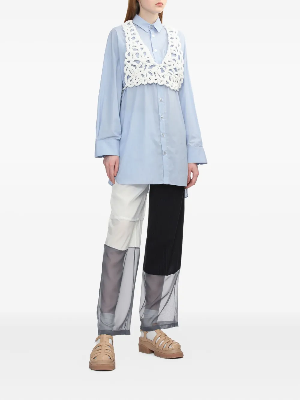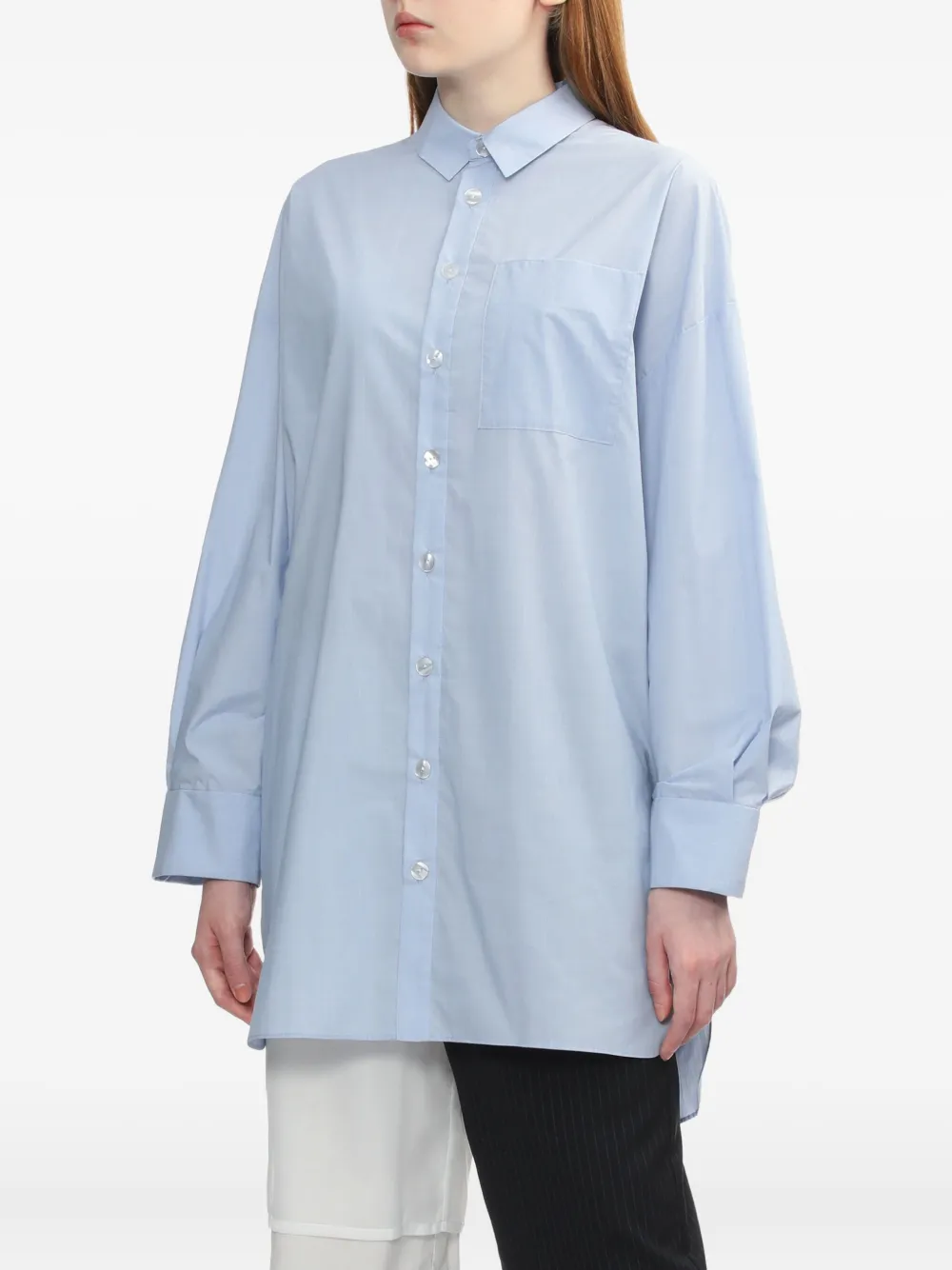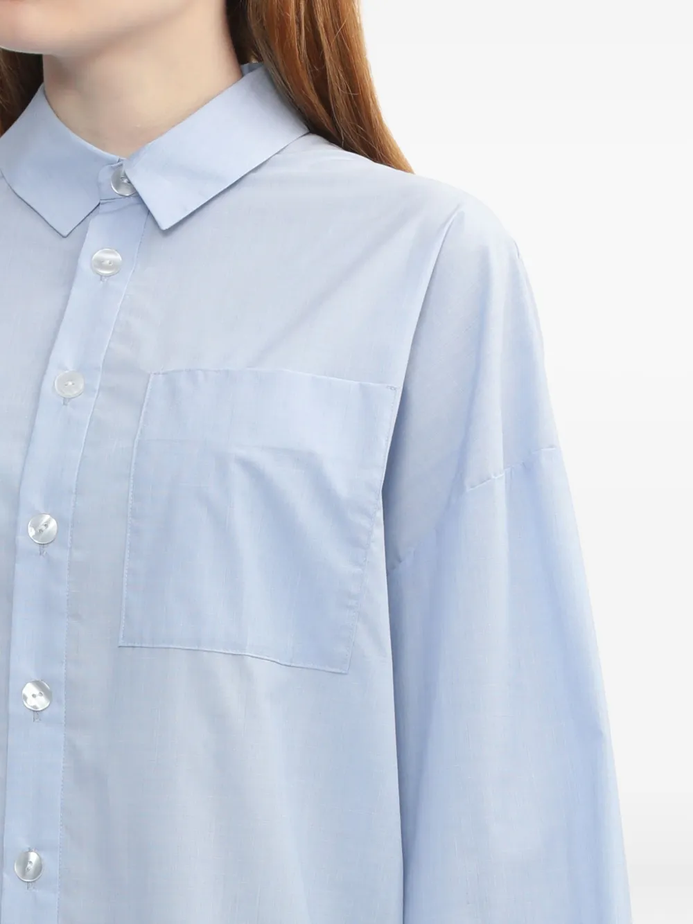 Светло-голубая застежка на пуговицы, длинные рукава, нагрудный карман, драпированная спина