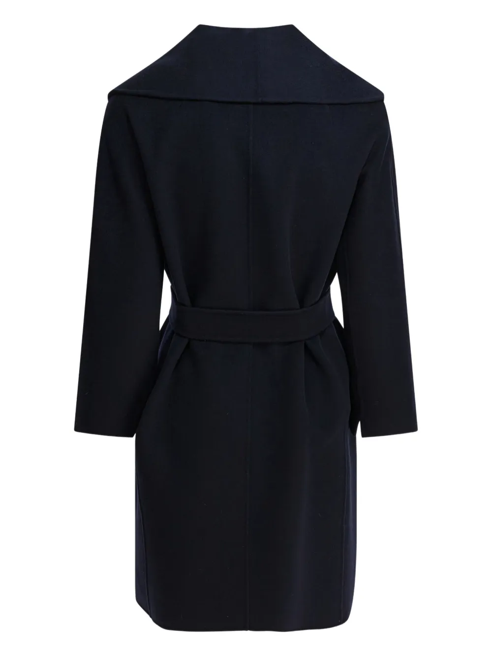 Темно-синий шерстяной халат-накидка с завязывающимся поясом, широкими лацканами и длинными рукавами