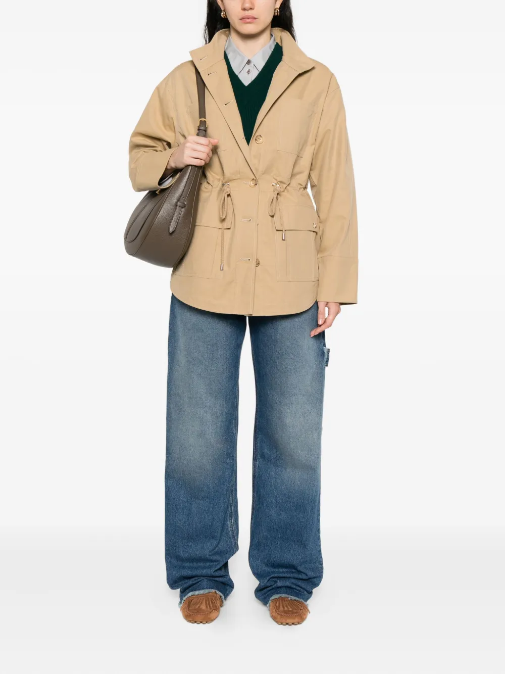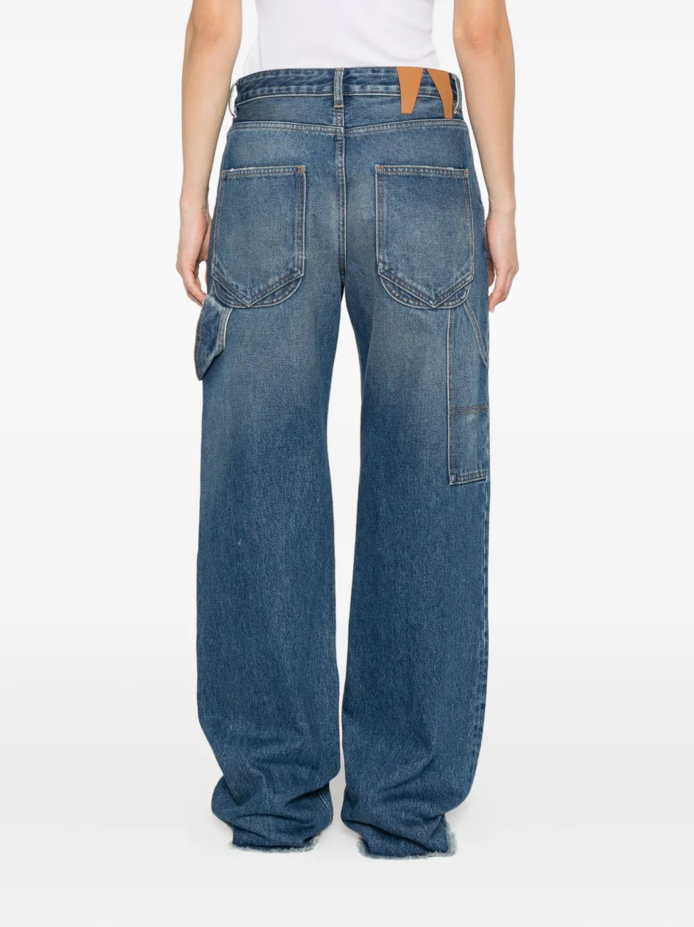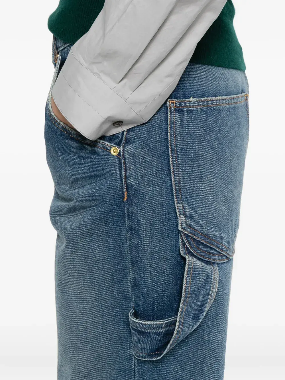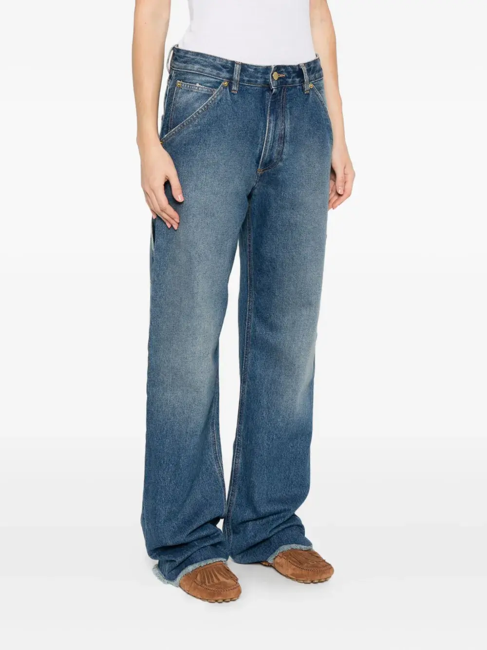 Средне-синий, с потертым краем, плотницкие карманы, застежка на пуговицы, пять карманов