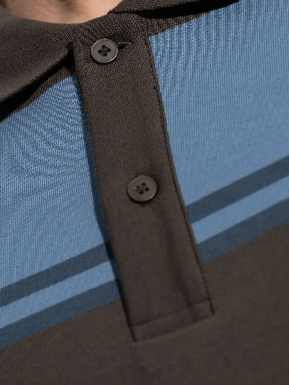 Полосатый узор стального синего цвета, длинные рукава, воротник-поло, застежка на пуговицы