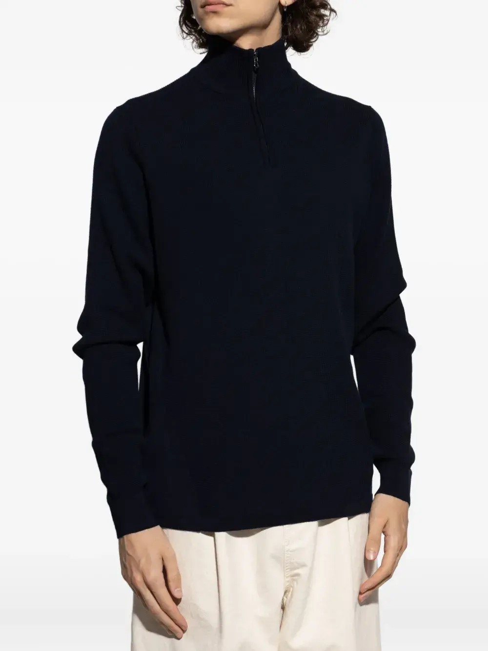 Синяя ребристая вязка, застежка-молния до середины бедра, длинные рукава, высокий ворот, прямой подол
