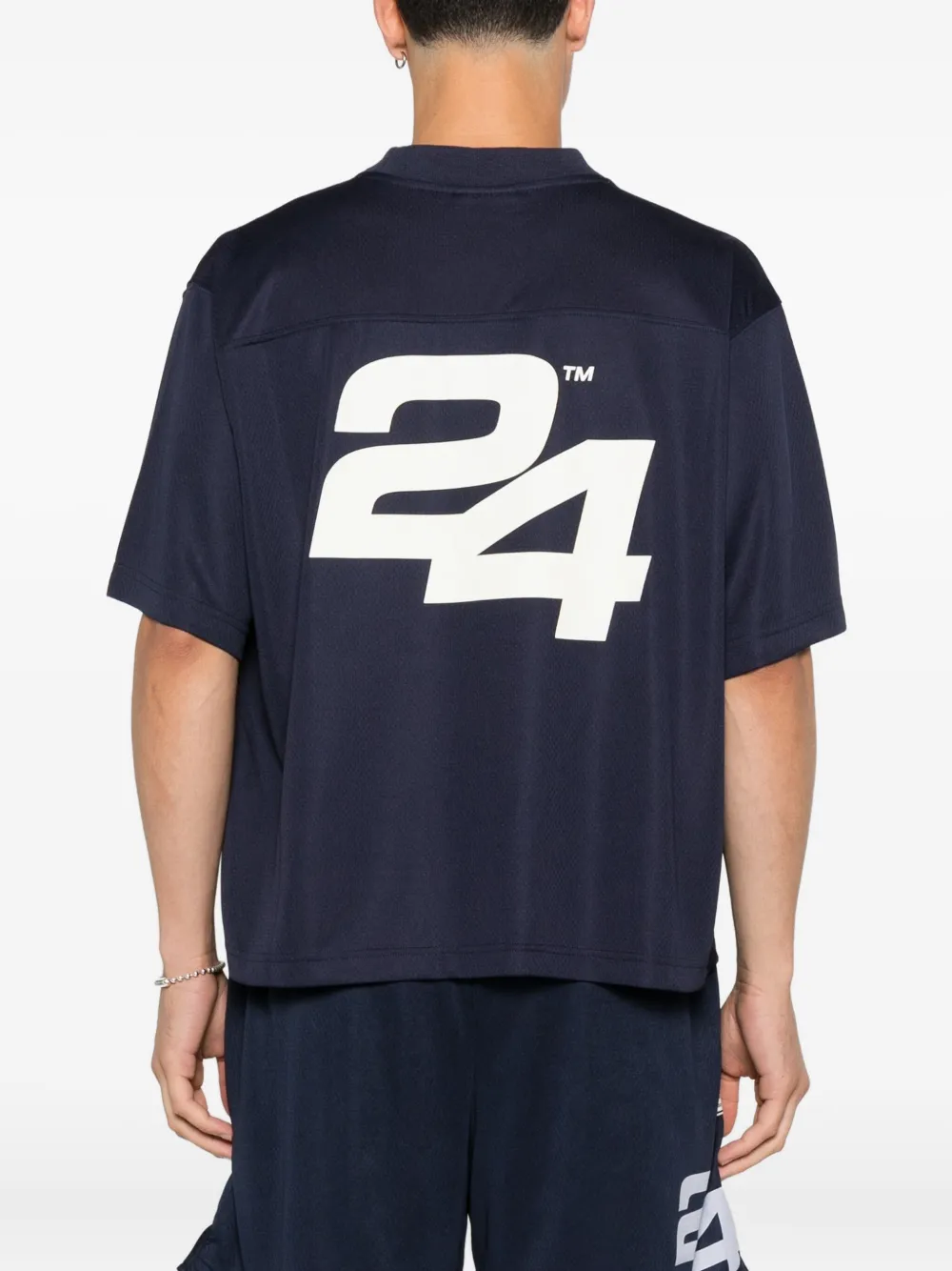 Настоящий темно-синий, короткие рукава, круглый вырез горловины, большой принт с логотипом, прямой подол