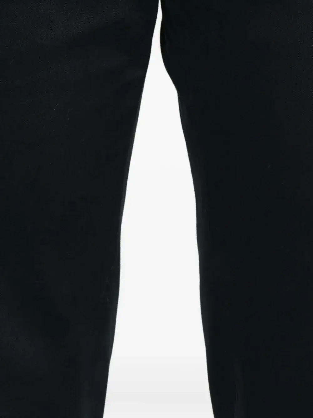 Темно-синего цвета, эластичный хлопковый прямой крой, застежка на пуговицы, боковые карманы