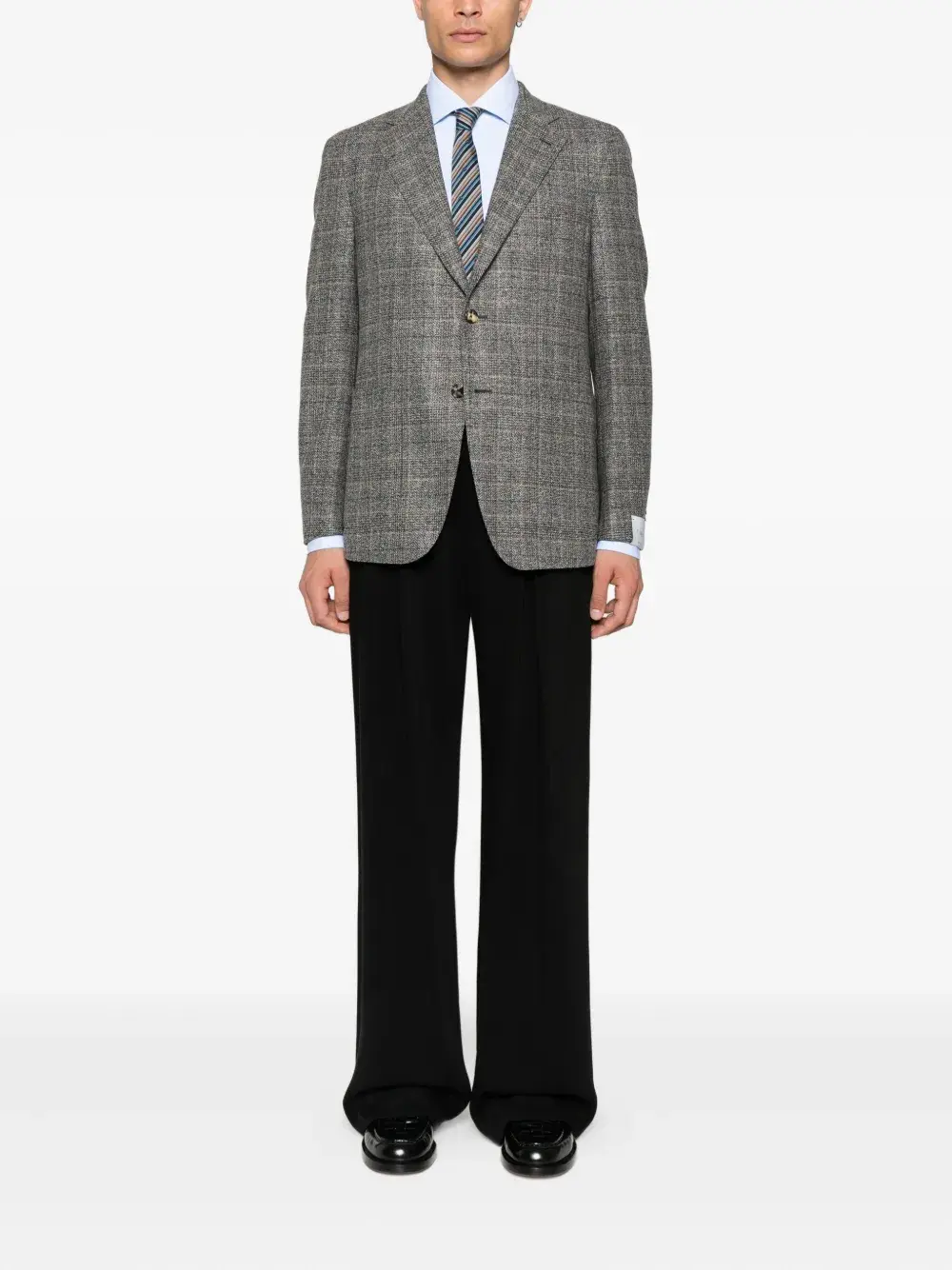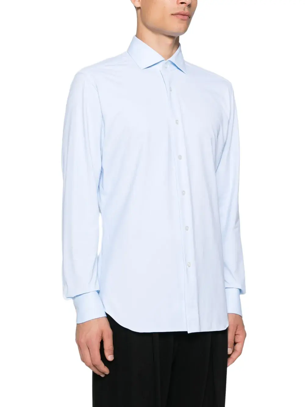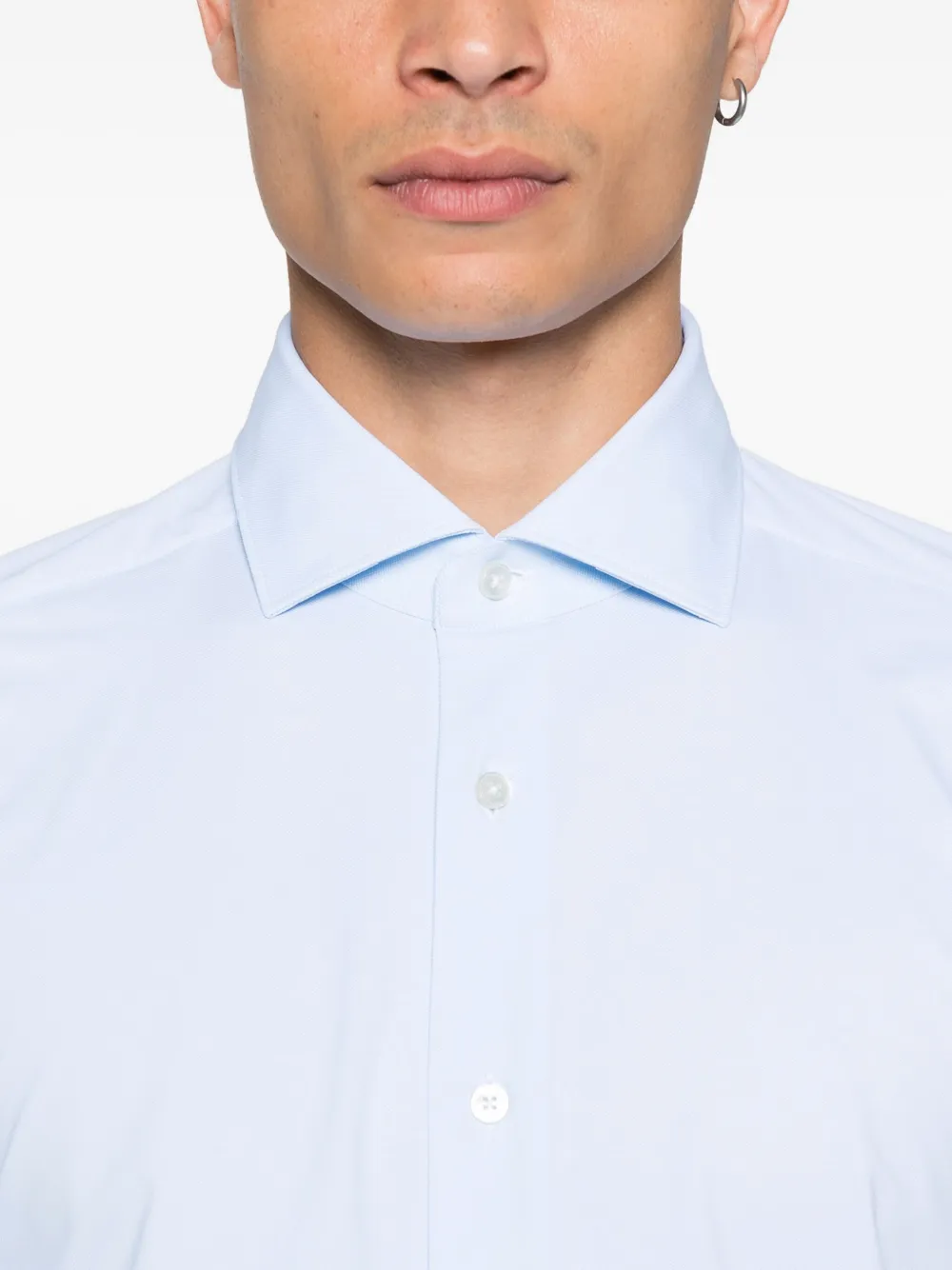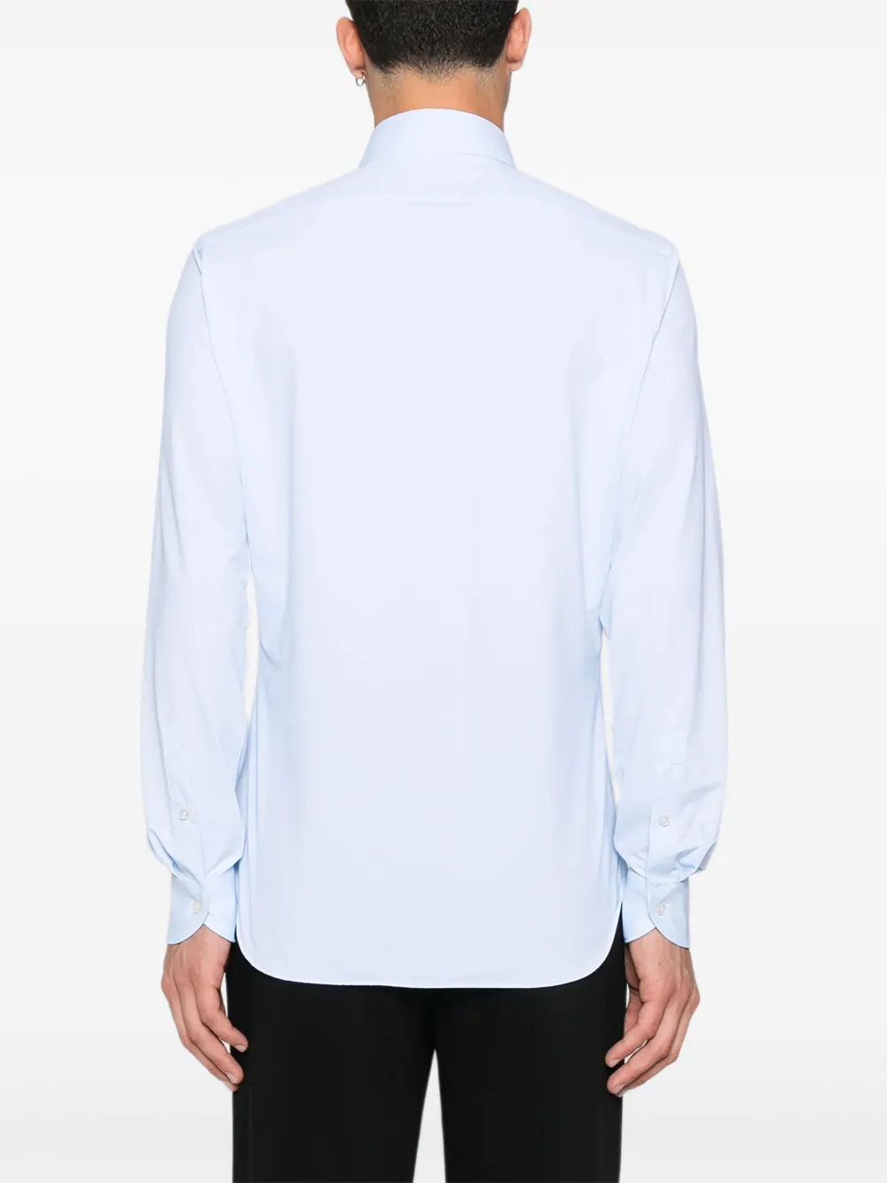 Светло-голубой вырезной воротник, длинные рукава, застежка на пуговицы спереди, закругленный подол, манжеты на пуговицах
