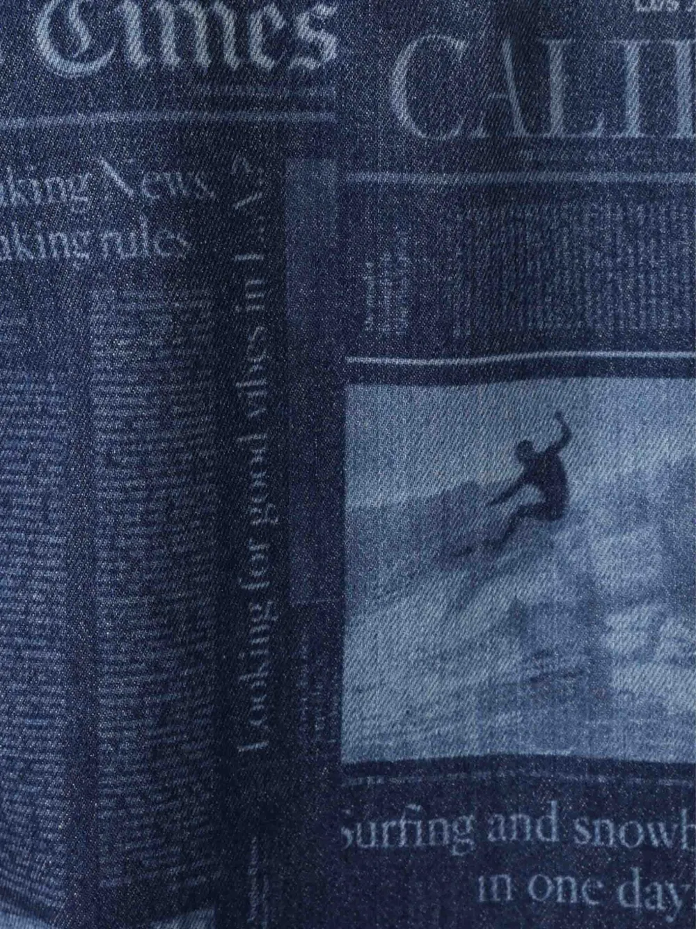Средне-голубой газетный принт, длинные рукава, застежка на кнопки, воротник, нагрудные карманы
