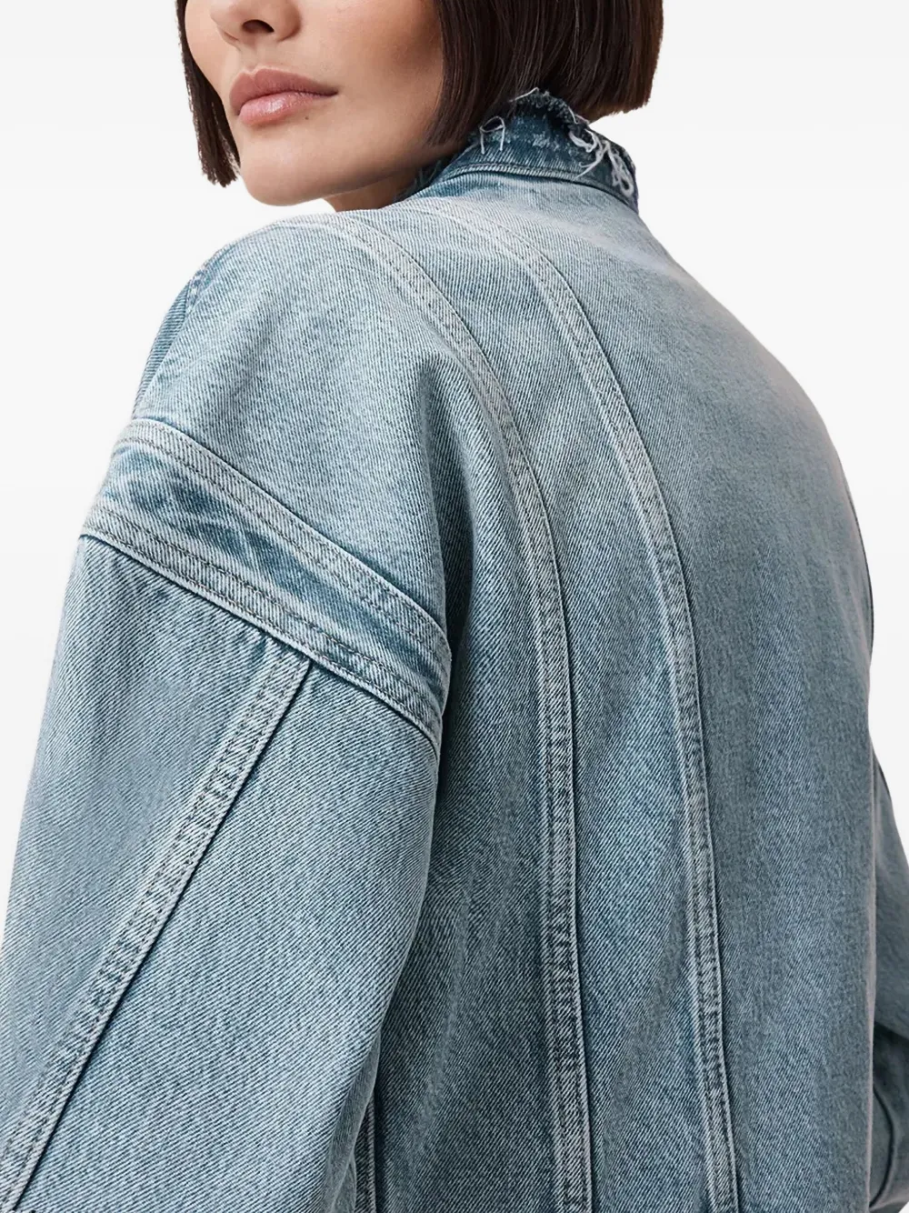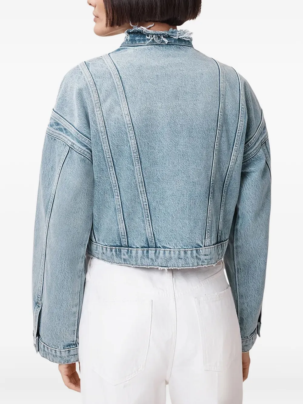 Светло-голубой индигово-синий воротник с бахромой, застежка на пуговицы, прорезные карманы, деталь шва на задней панели