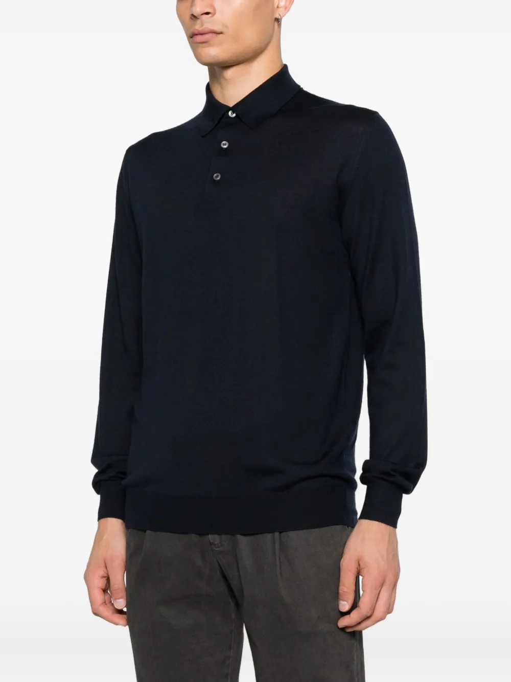 Темно-синяя шерсть с длинными рукавами, воротником-поло, застежкой на пуговицы
