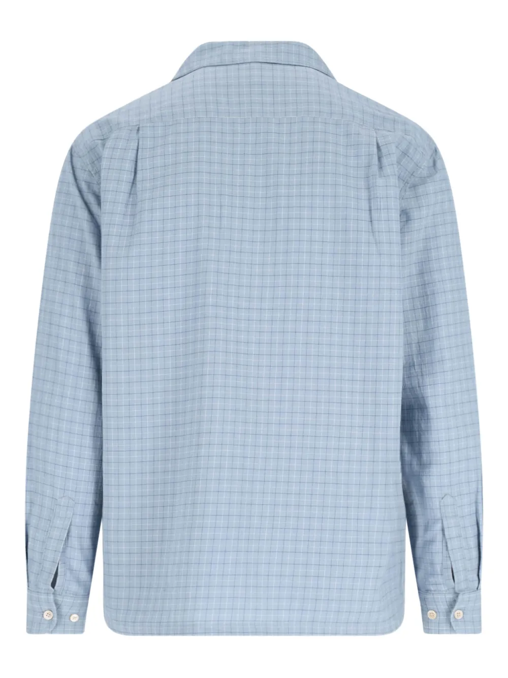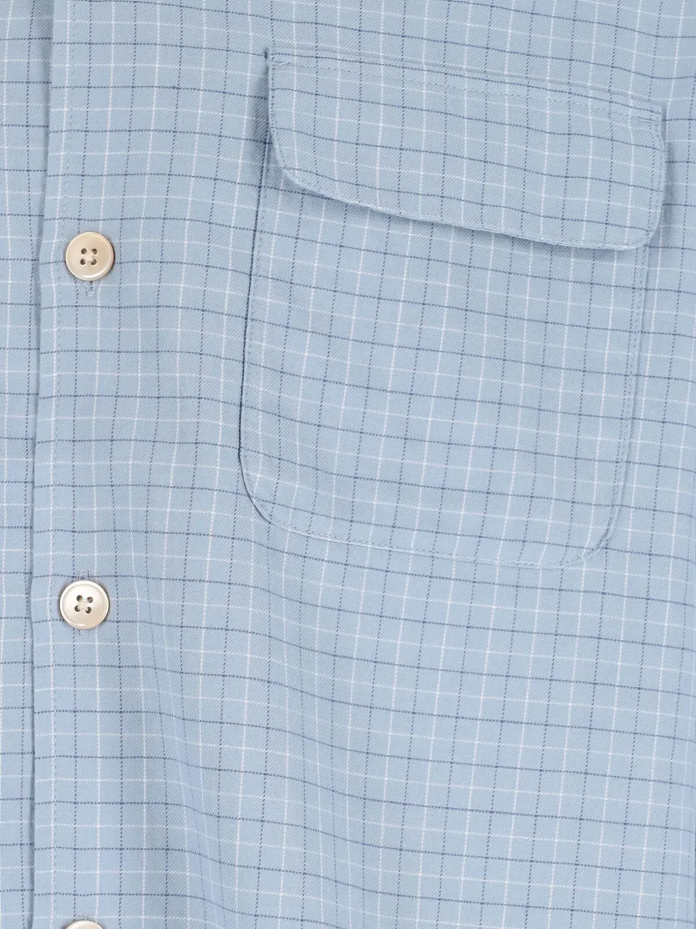 Светло-голубой клетчатый узор, застежка на пуговицы, длинные рукава, два нагрудных кармана, воротник-стойка