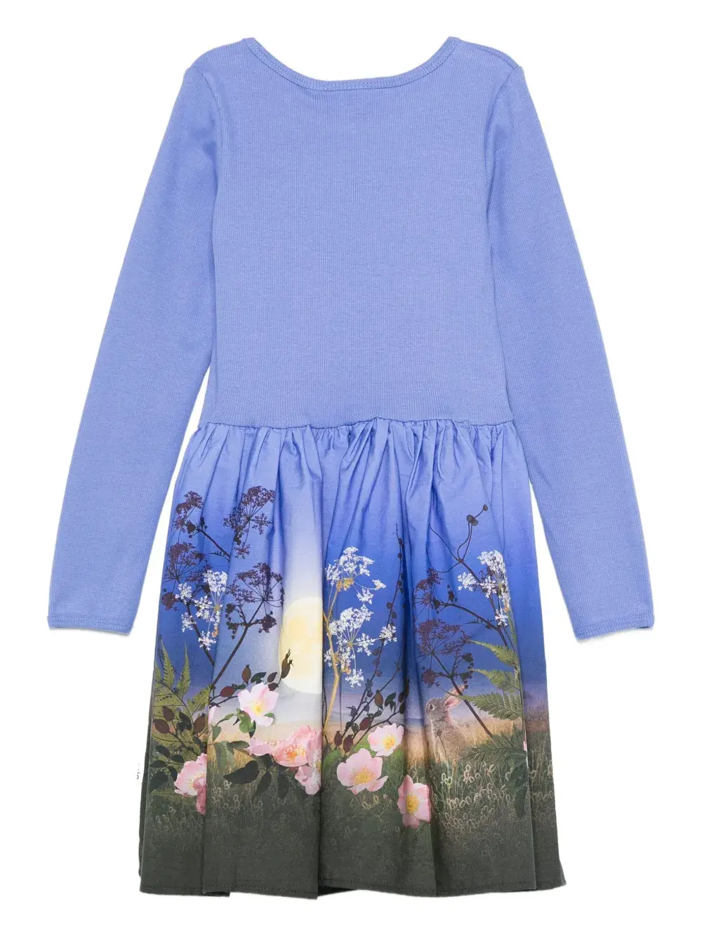 Синяя юбка с длинными рукавами, ребристым лифом, круглым вырезом, расклешенной юбкой с цветочным принтом