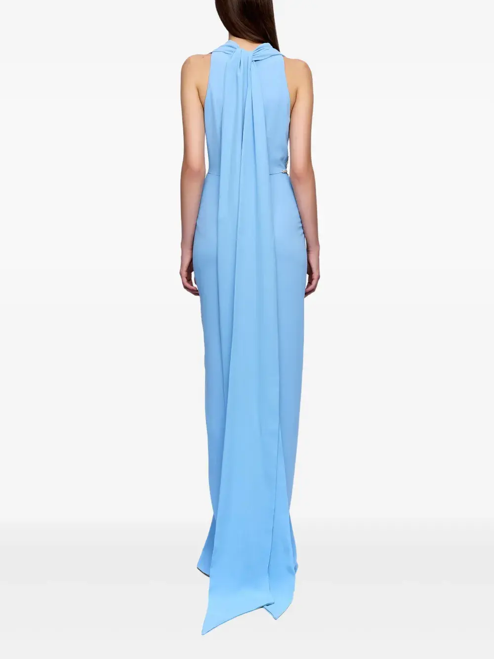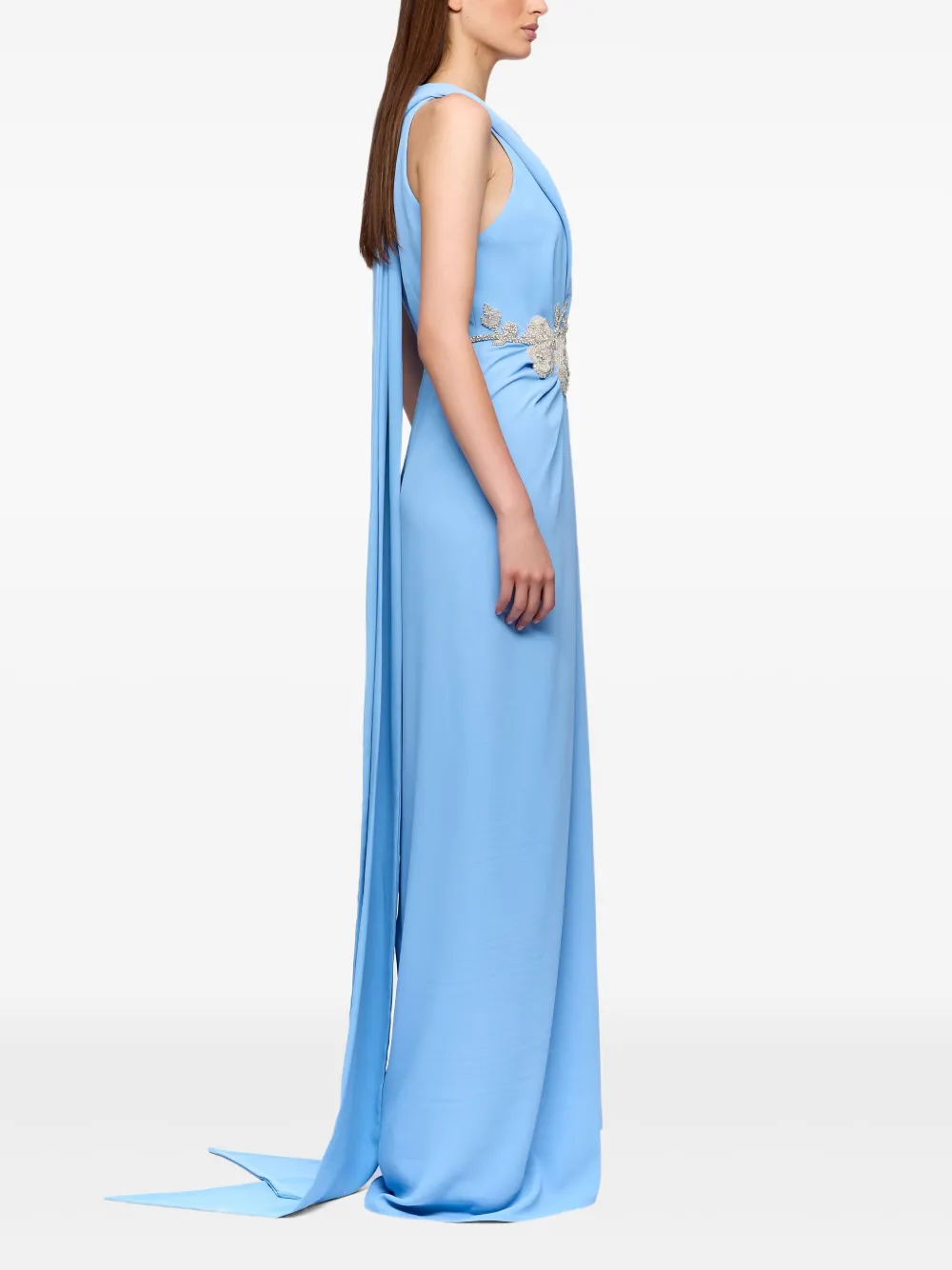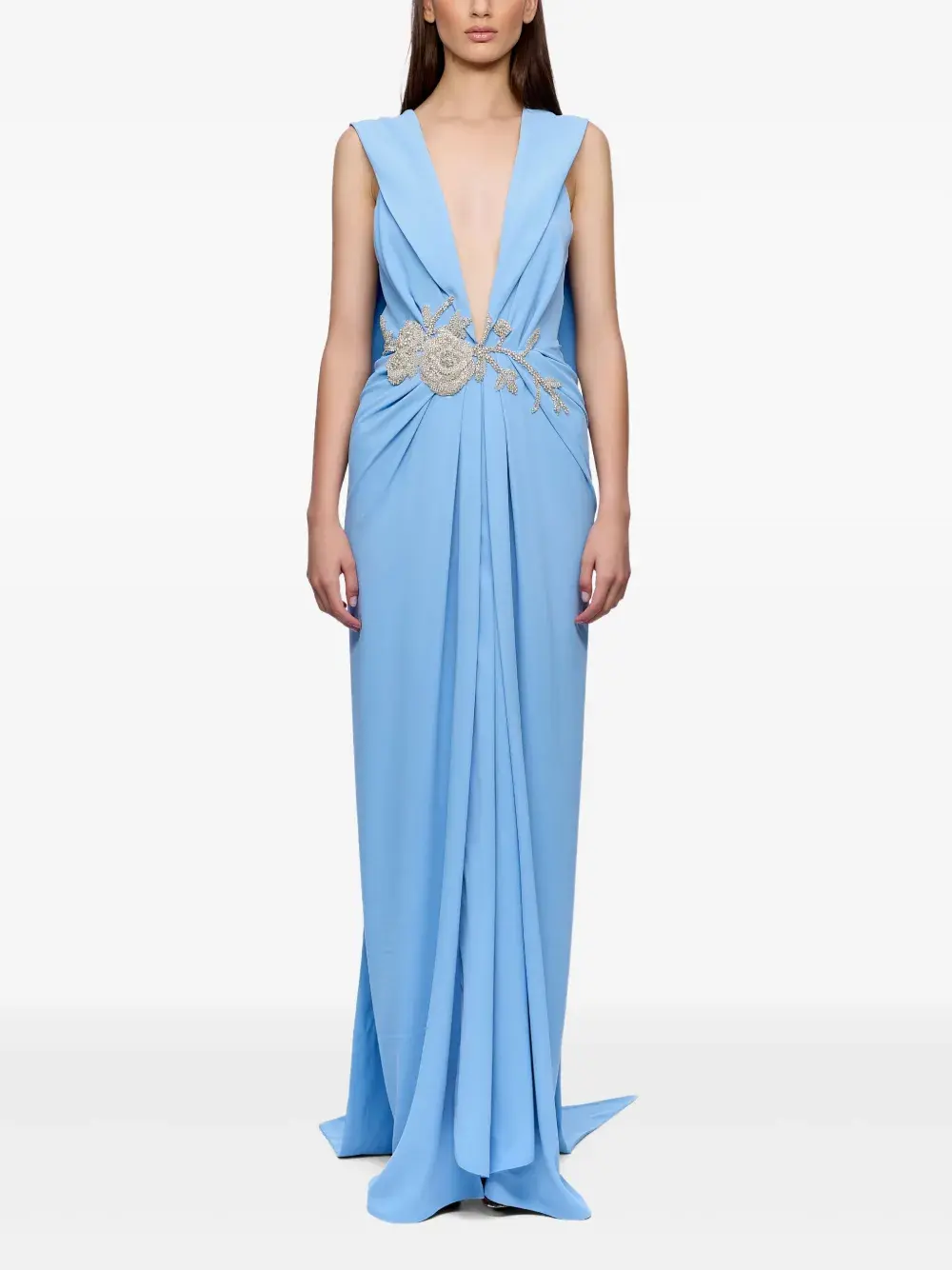 Светло-голубое платье без рукавов с глубоким вырезом, украшенное цветочным узором, со шлейфом длиной до пола