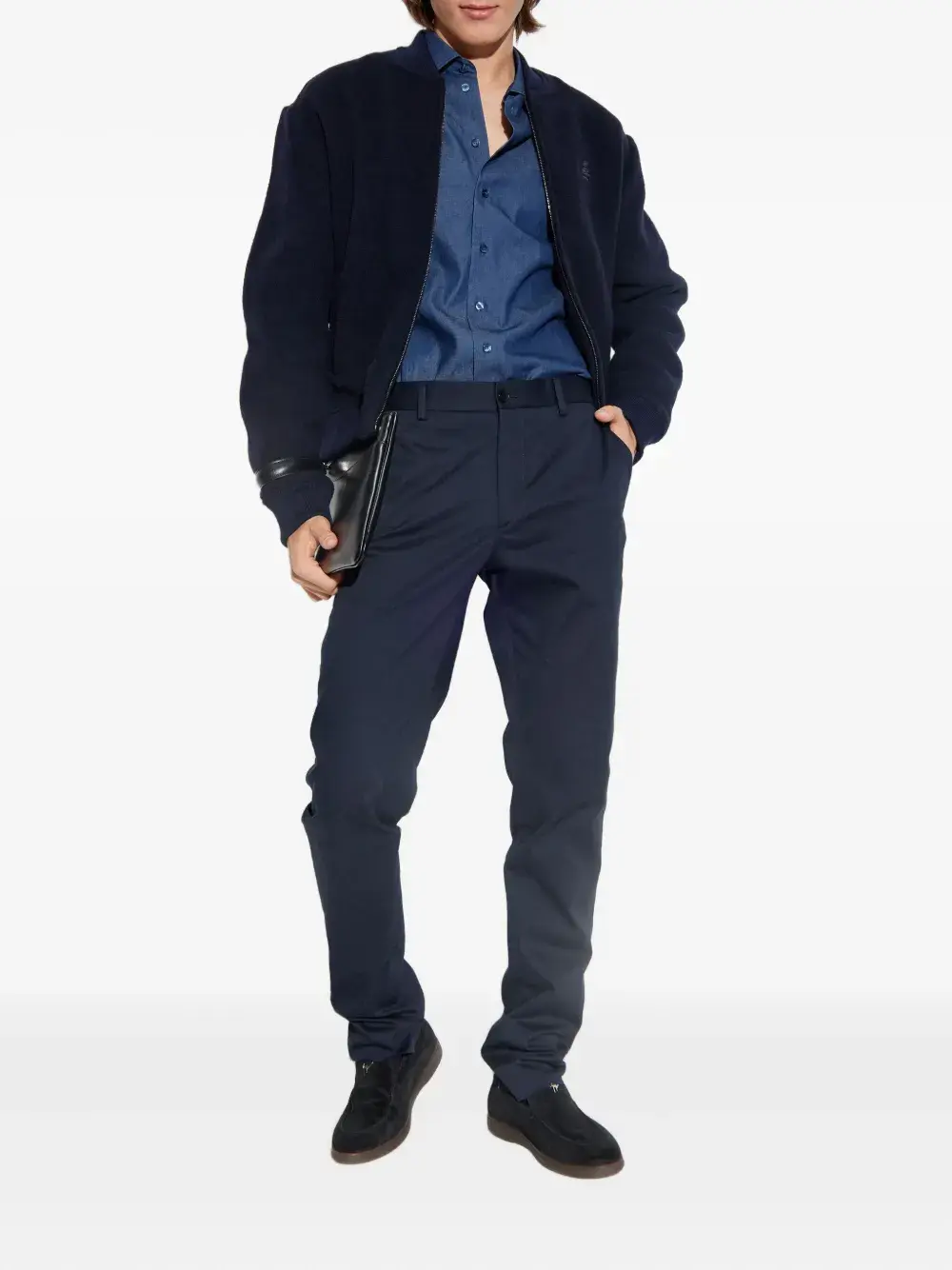 Темно-синий хлопок, плоская передняя часть, застежка на пуговицы, боковые карманы, прорезные задние карманы