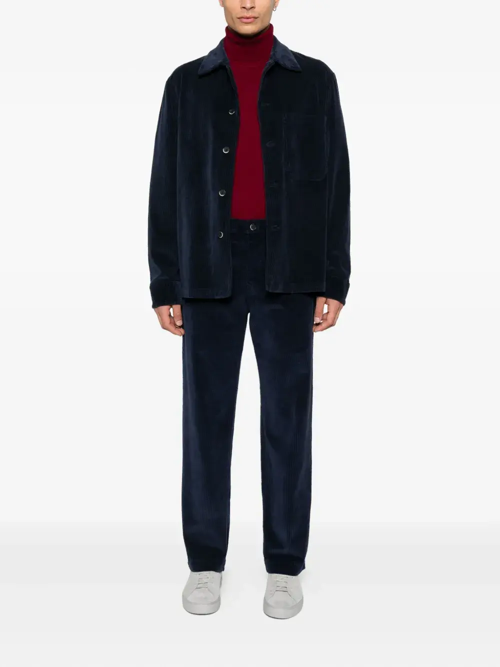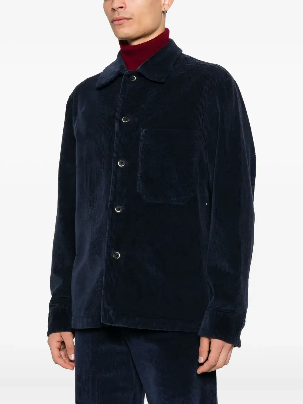 Темно-синий вельветовый фактурный материал, застежка на пуговицы, длинные рукава, накладной карман
