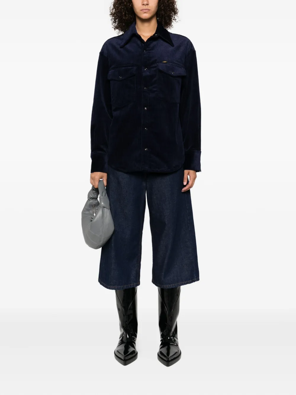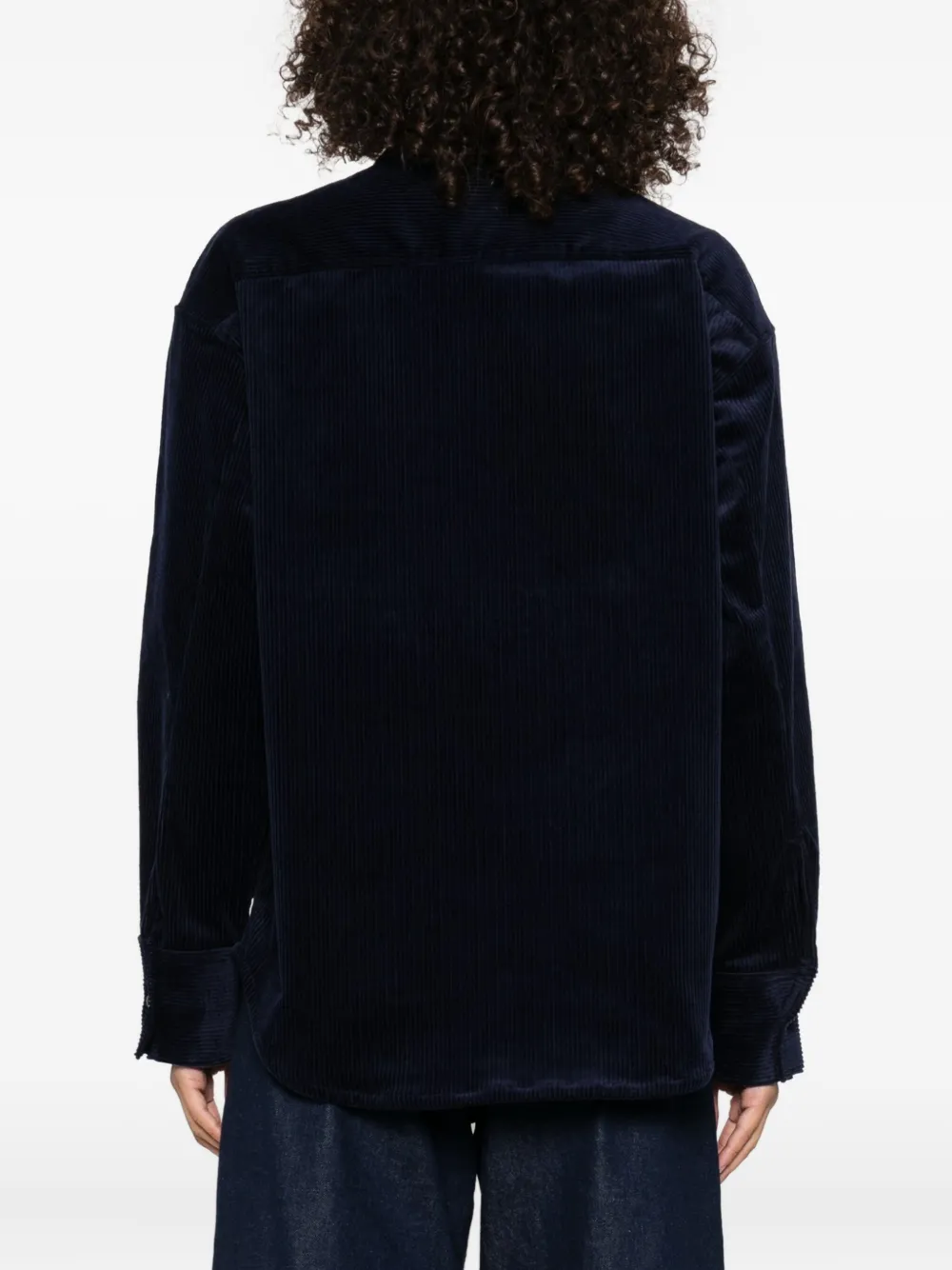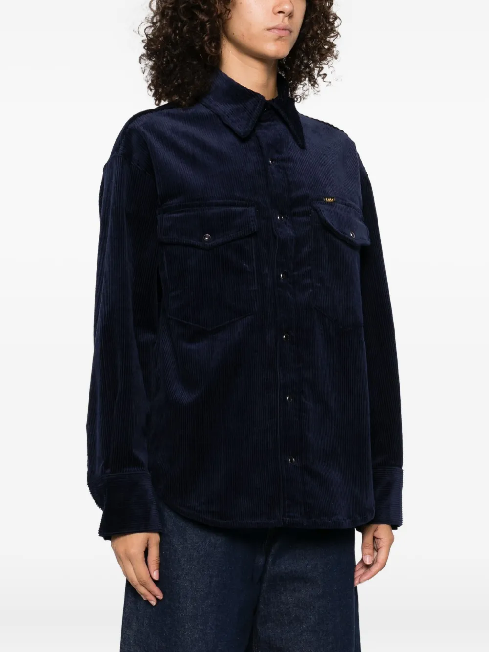 Темно-синий вельветовый фактурный материал, застежка на пуговицы, длинные рукава, два нагрудных кармана, закругленный подол