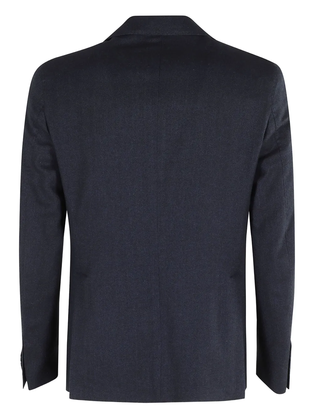 Синие накладные карманы, зазубренные лацканы, длинные рукава