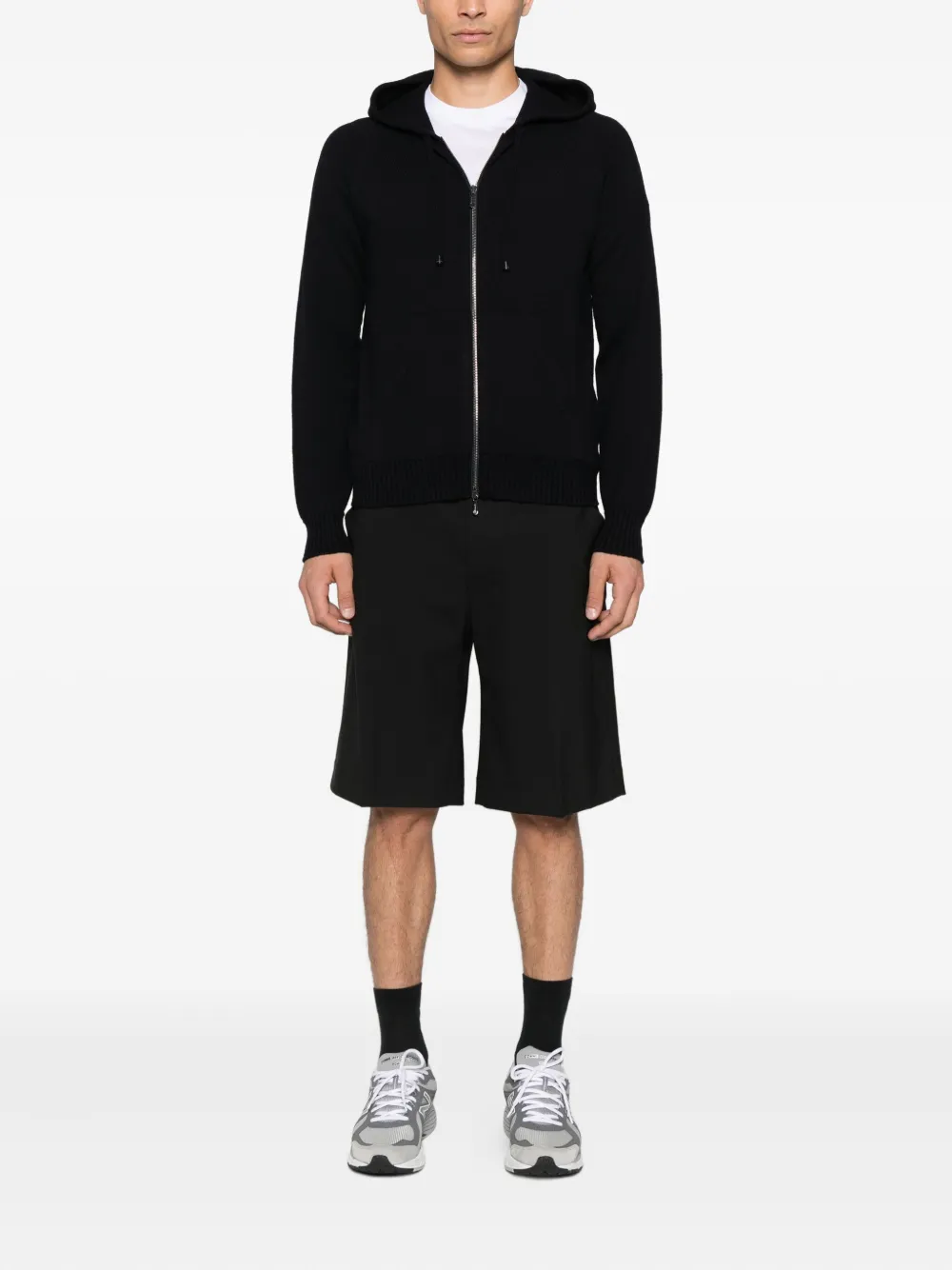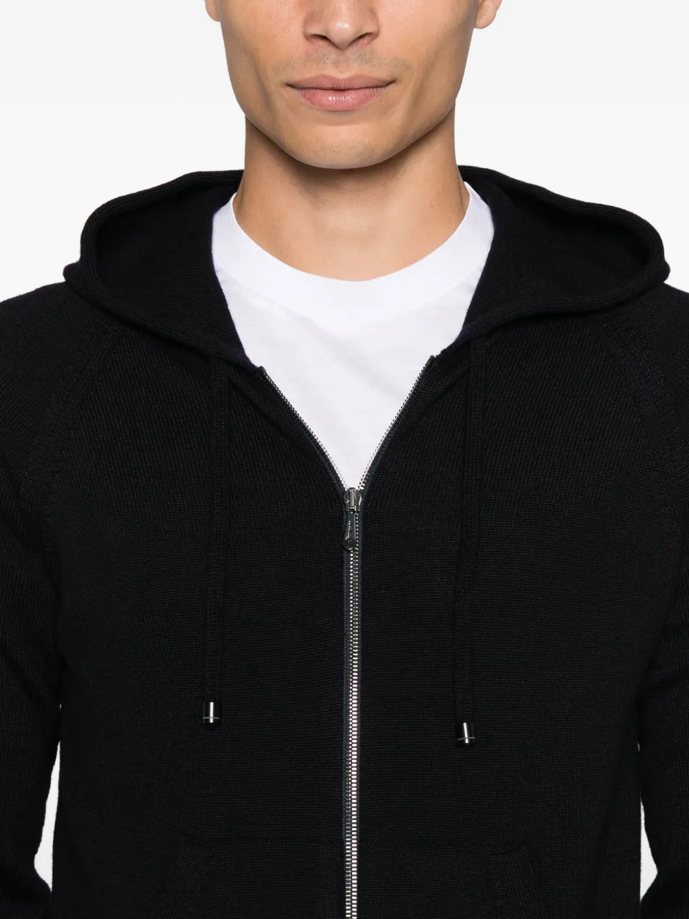 Темно-синяя мериносовая шерсть, ребристые манжеты и подол, капюшон, длинные рукава