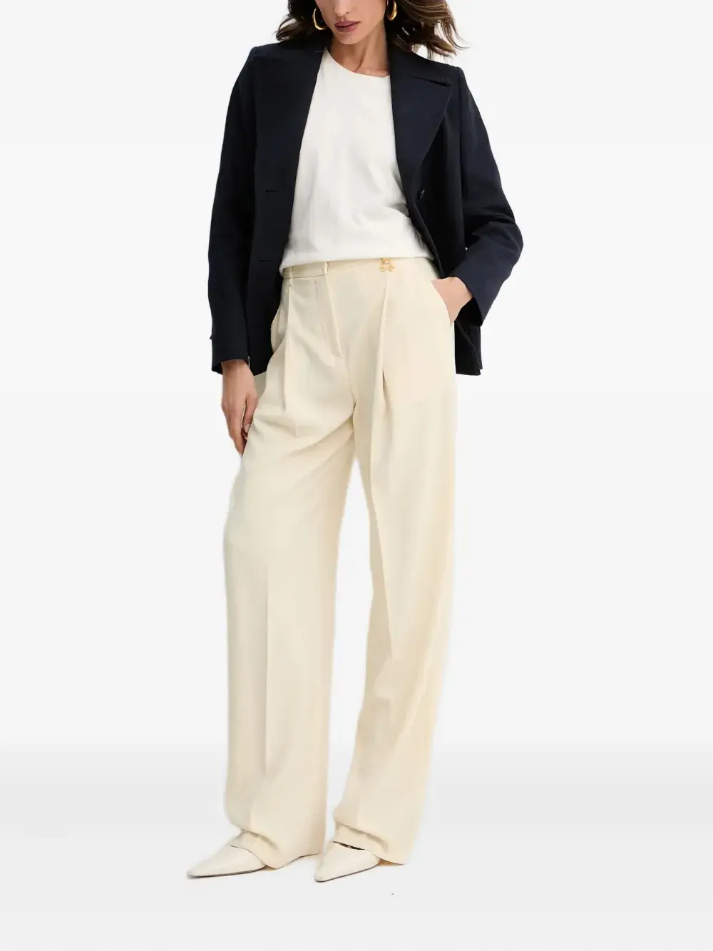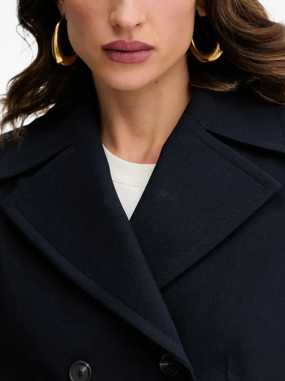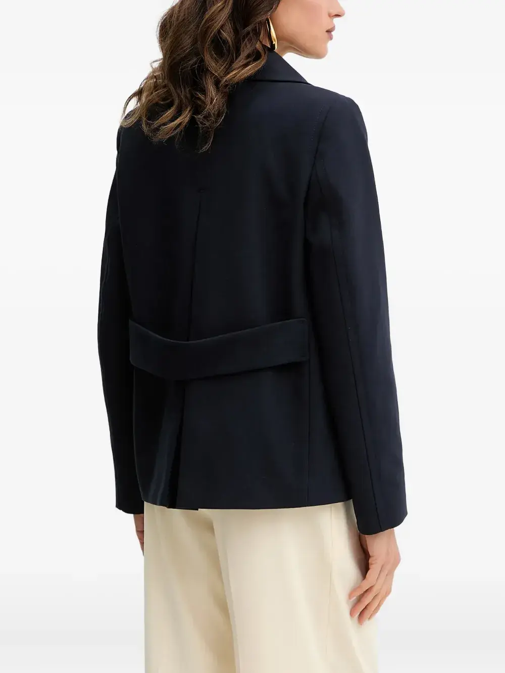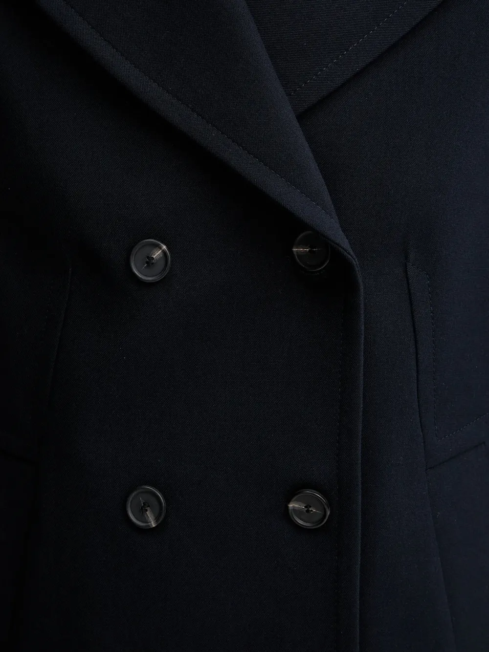 Темно-синий двубортный пиджак с застежкой на пуговицы и широкими отложными лацканами
