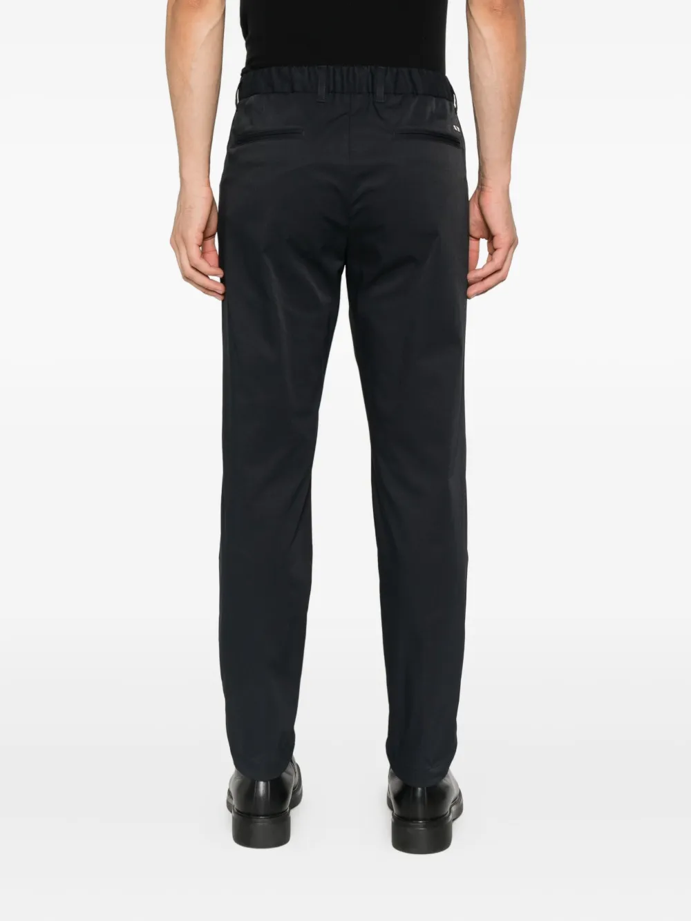 Черные складки спереди, затягивающиеся на шнурок, боковые карманы, прямые штанины, плоский перед