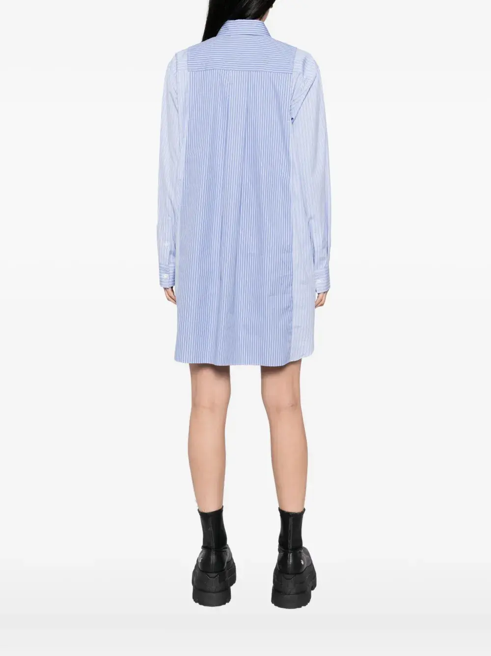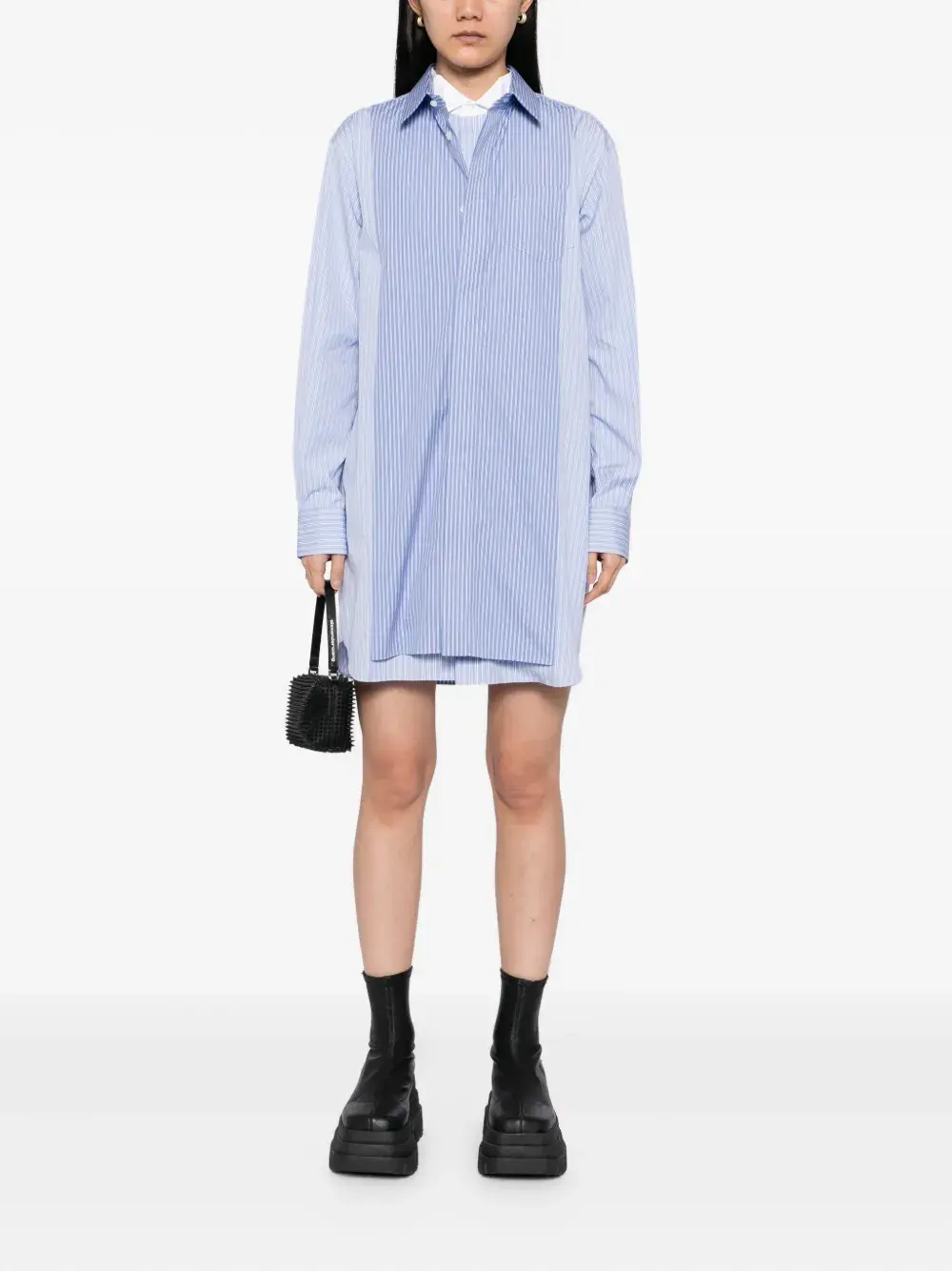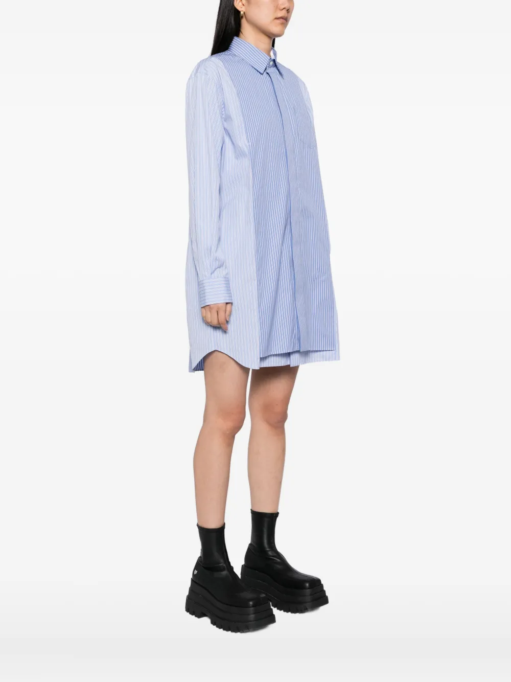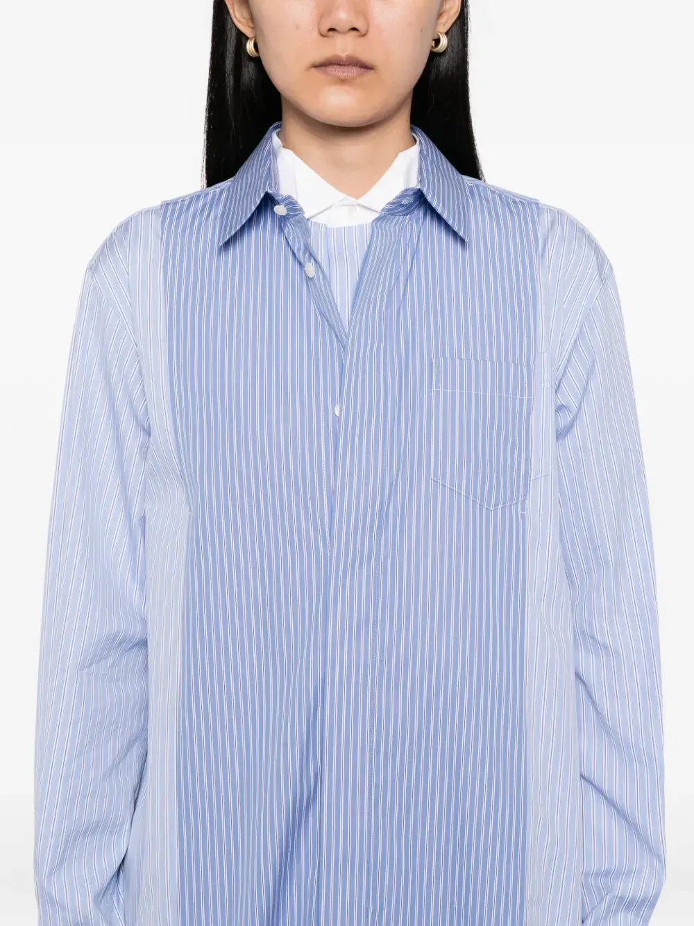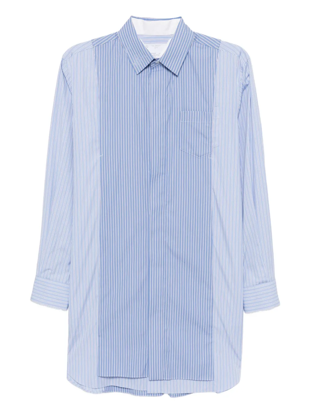 Василькового цвета, потайная застежка на пуговицы спереди, два накладных кармана на груди, рукава с застегивающимися манжетами