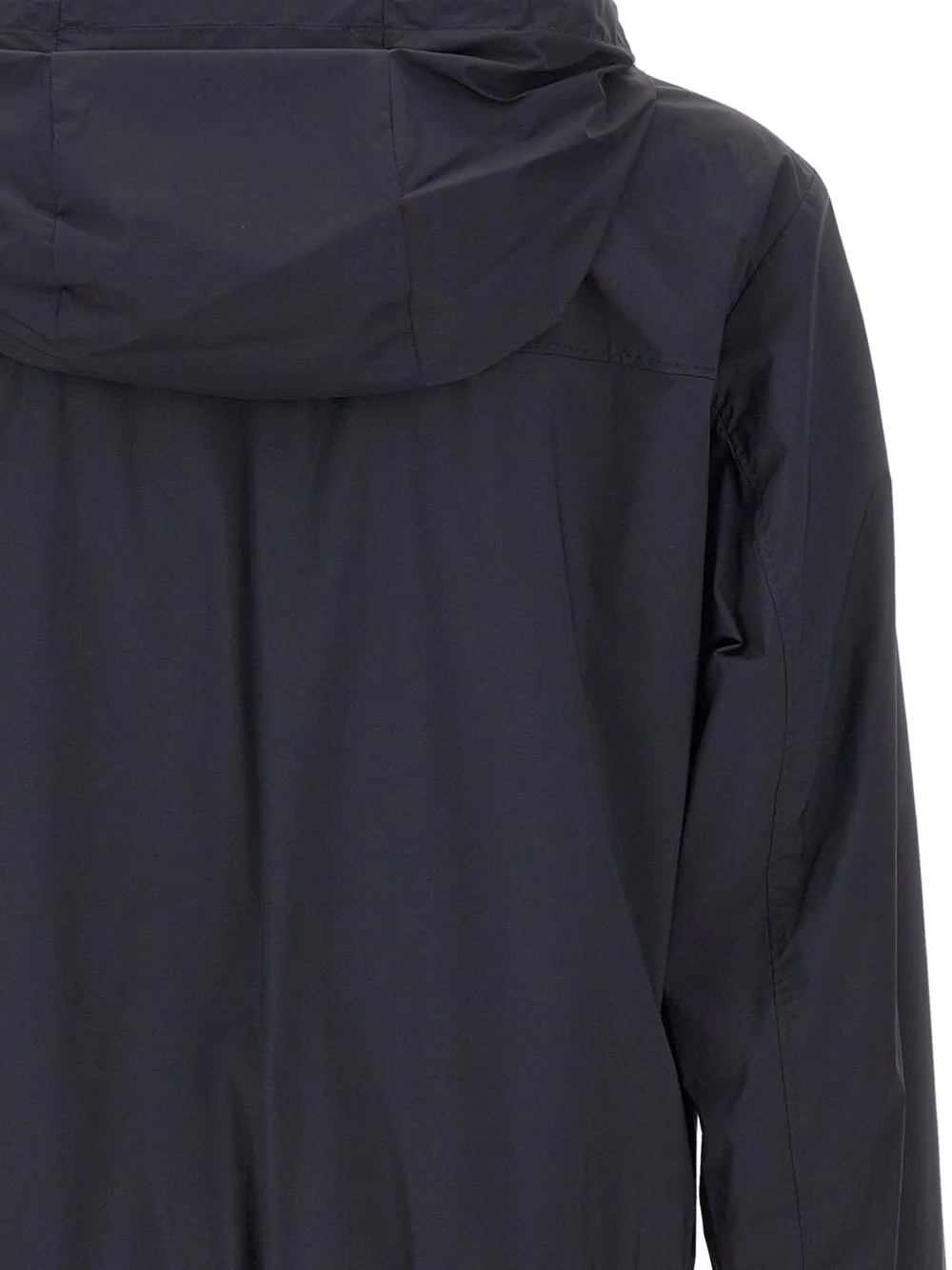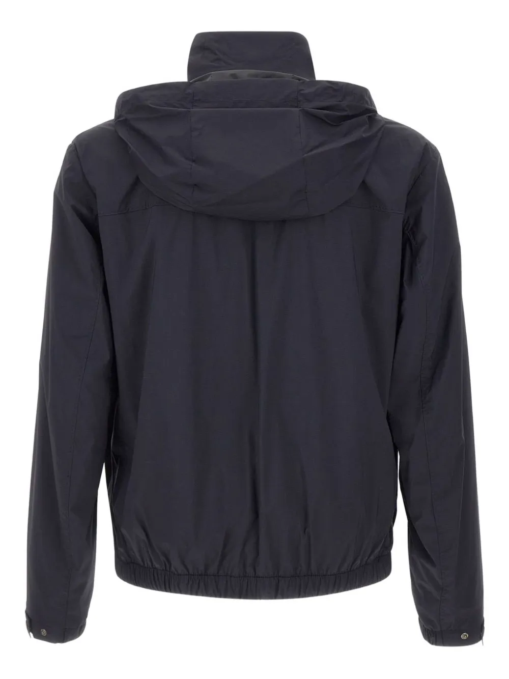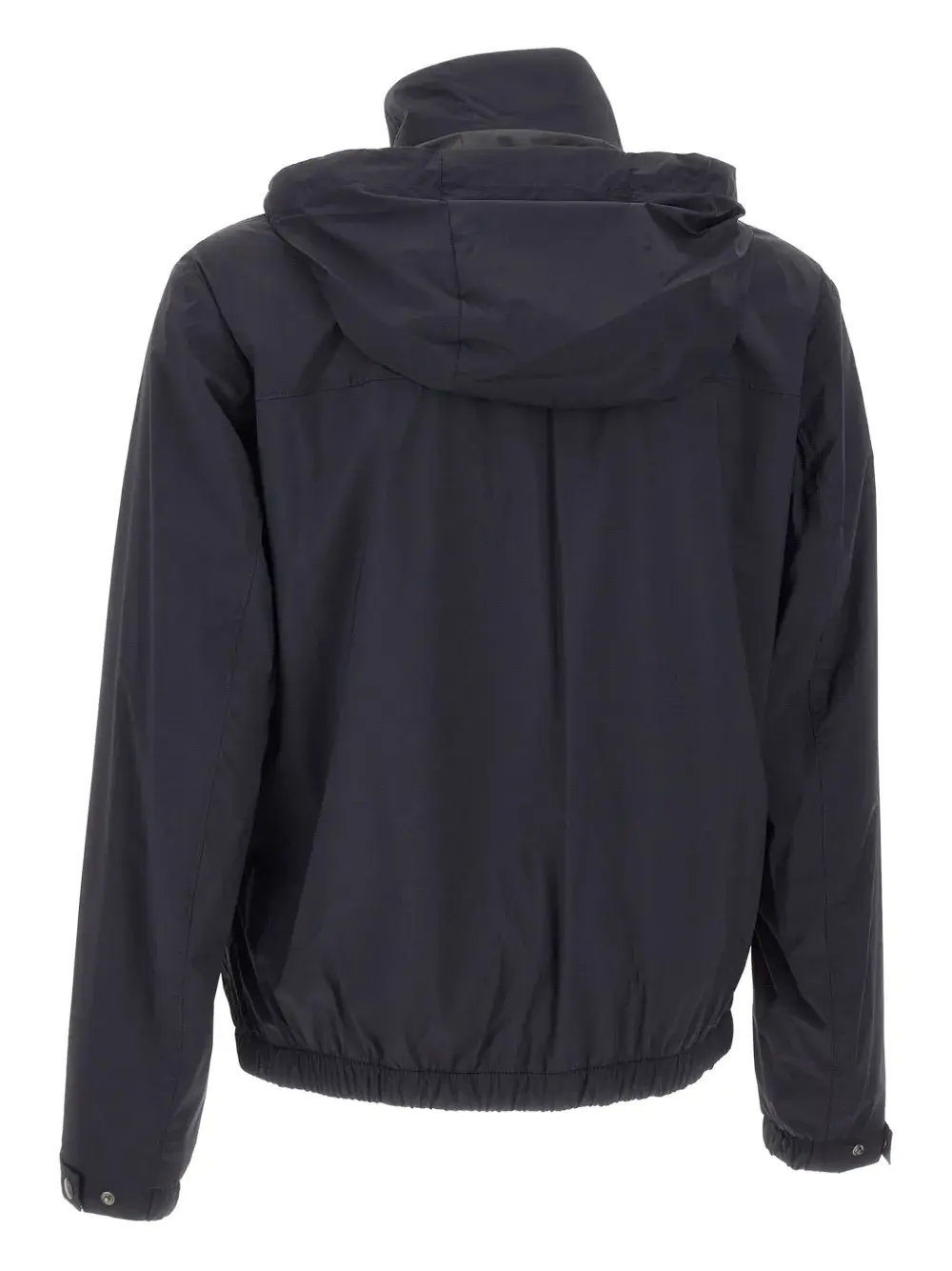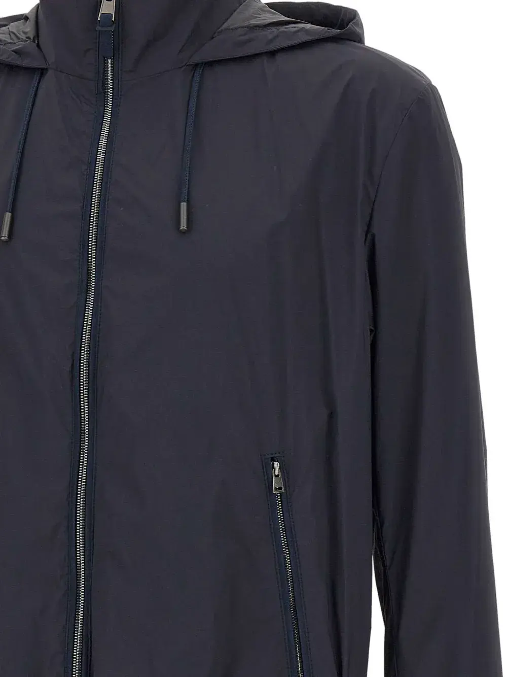Синий капюшон, застежка-молния, боковые карманы, эластичный подол, регулируемые манжеты