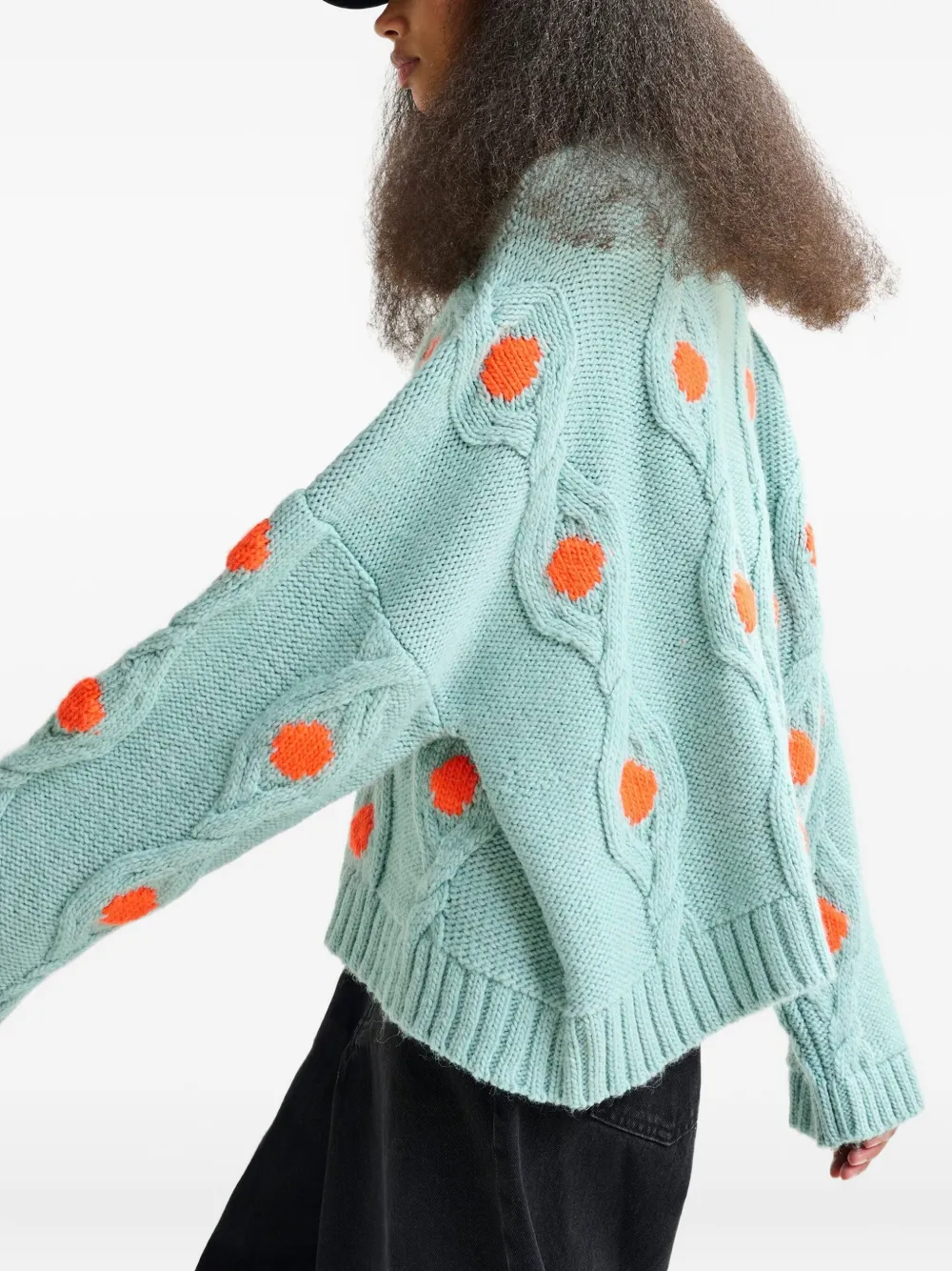 Светло-голубой вязаный косой трикотаж с заниженными плечами и ребристыми отделками