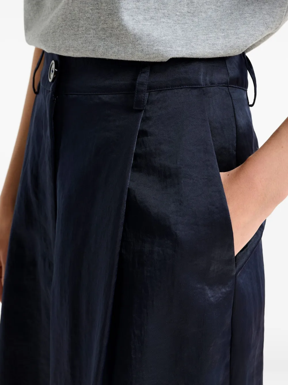 Синие плиссированные передние широкие штанины с прорезными карманами на крючках и молниях
