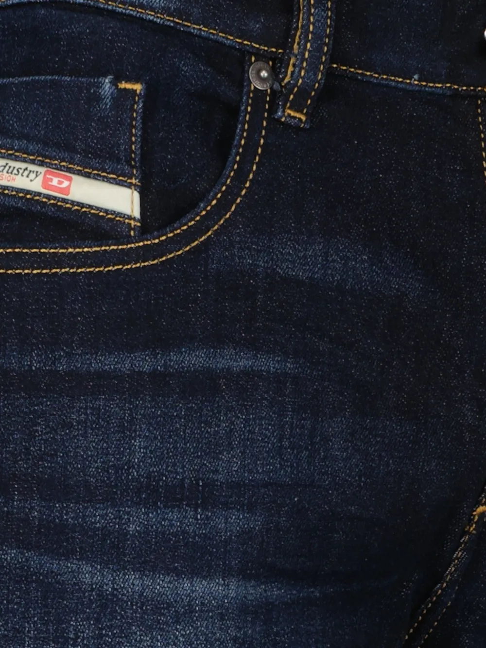 Темно-синий пятикарманный дизайн с застежкой на молнию и пуговицами, логотипом и золотой строчкой