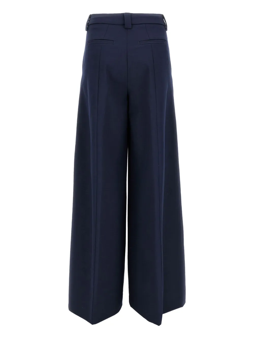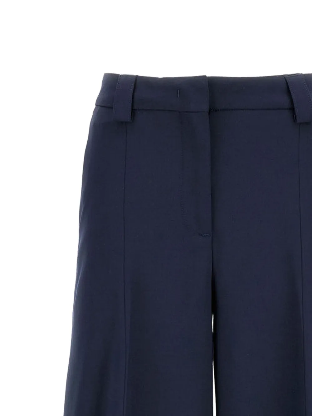 Темно-синие широкие штанины спереди, потайная застежка по бокам, складки спереди