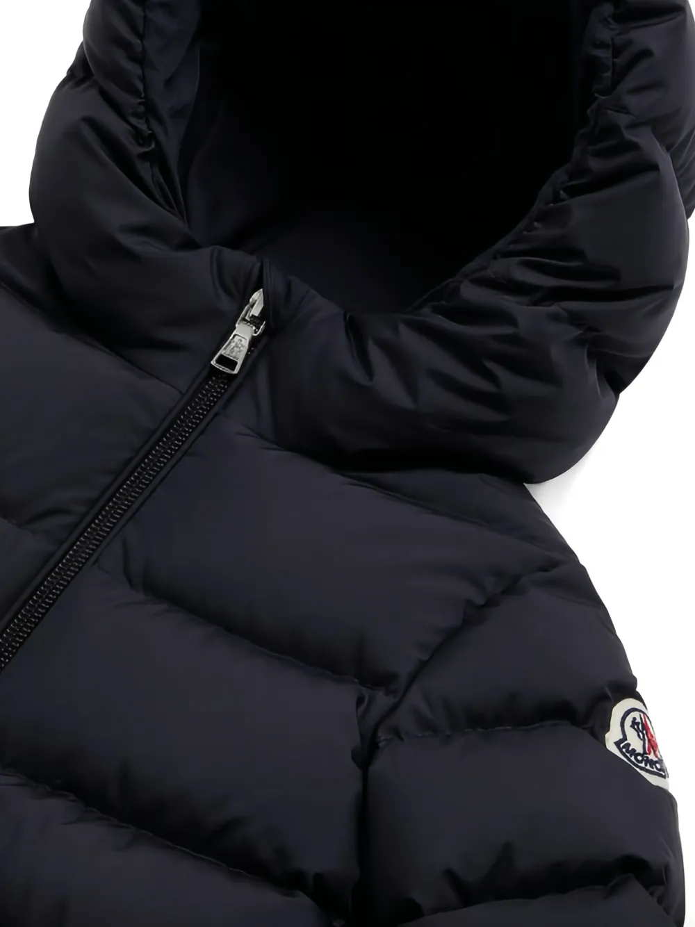 Темно-синий стеганый дизайн, капюшон, застежка-молния, оборка, нашивка с логотипом