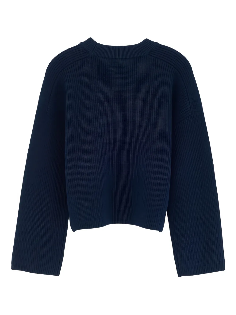 Темно-синий ребристая вязка, круглый вырез горловины, длинные рукава, свободный подол, мериносовая шерсть