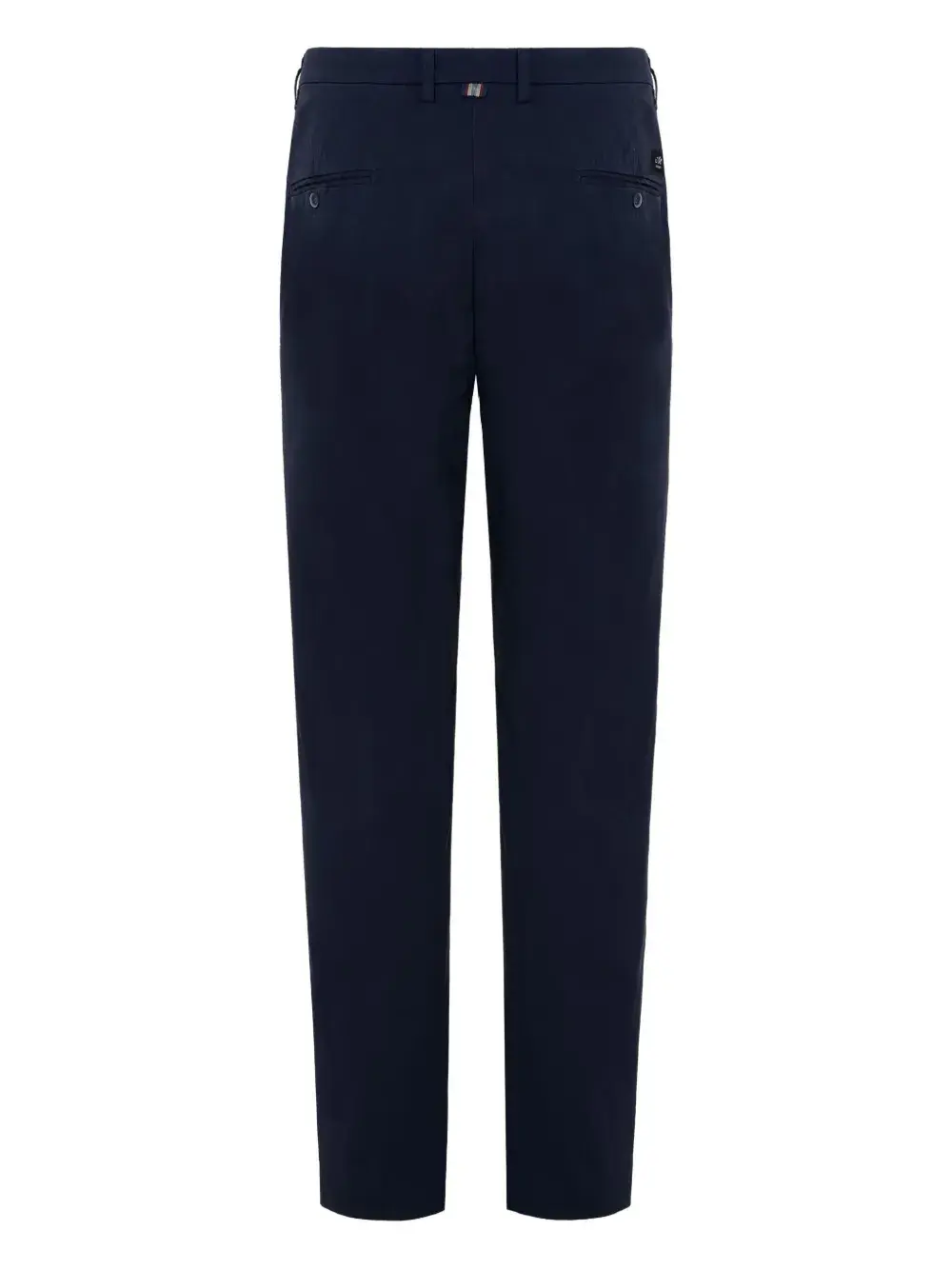 Темно-синяя плоская застежка на пуговицы спереди, шлевки для ремня, два боковых кармана, два задних кармана