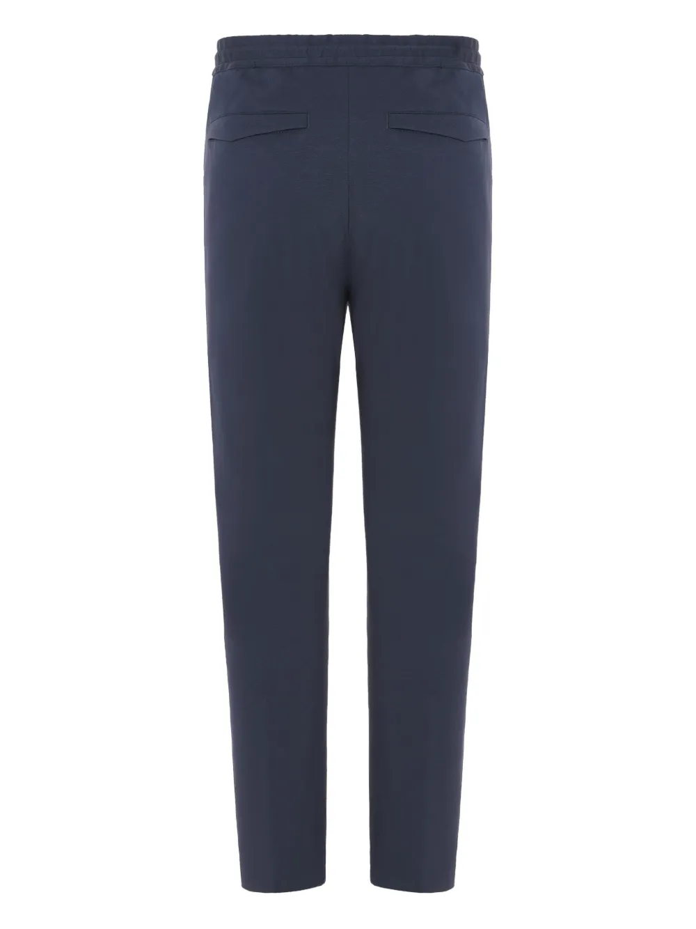Темно-синий пояс на резинке со шнурком, прямые штанины, задние прорезные карманы