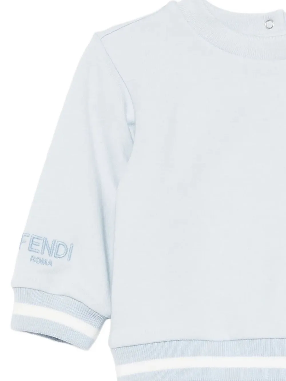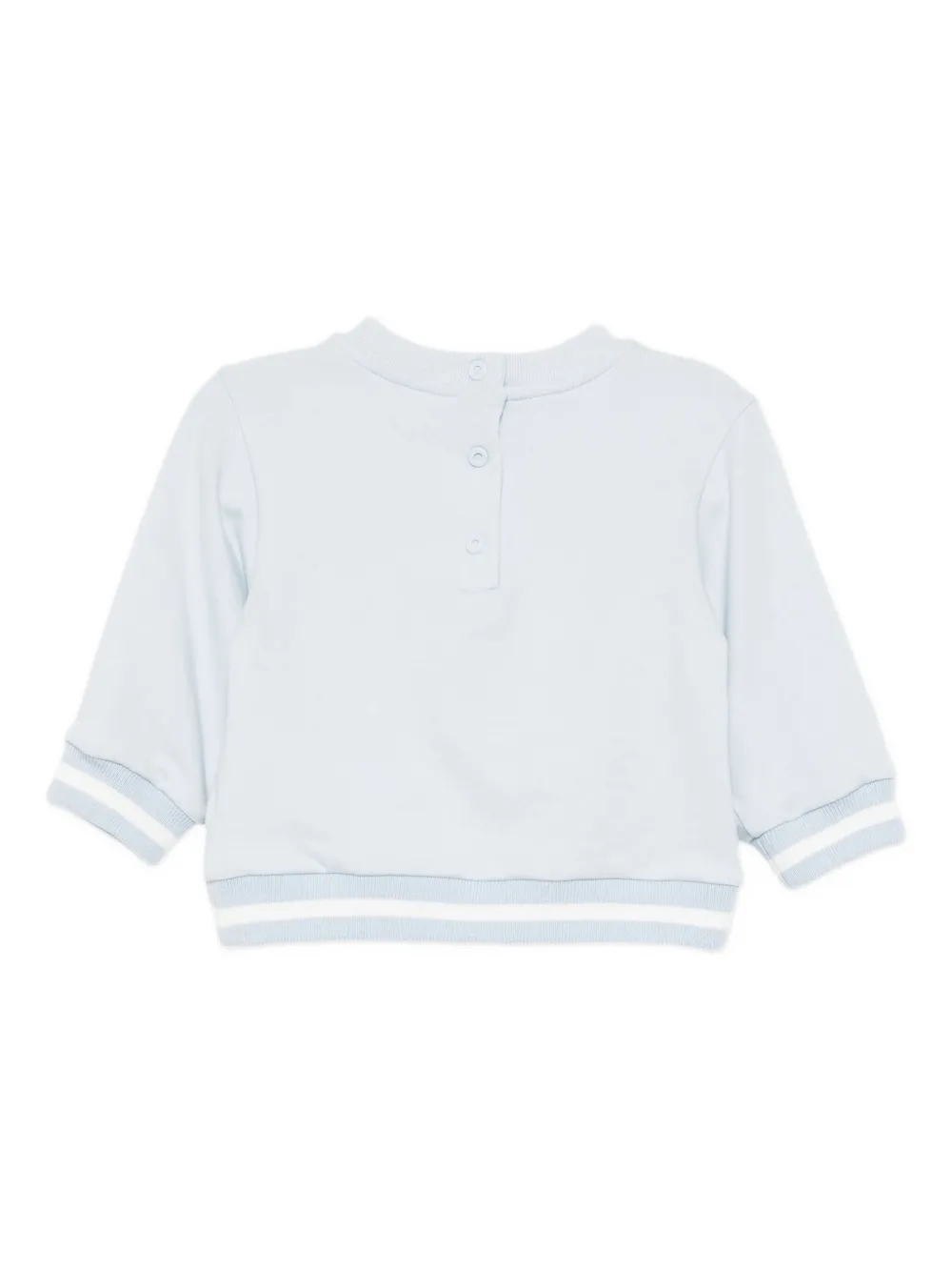 Светло-голубой вышитый логотип с изображением плюшевого мишки, ребристые манжеты, ребристый подол, круглый вырез горловины
