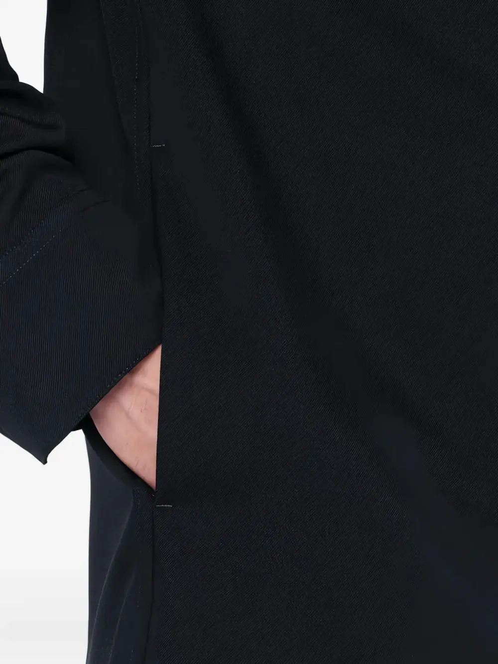 Синие длинные рукава, застегивающиеся на пуговицы манжеты, прорезные карманы, воротник-стойка