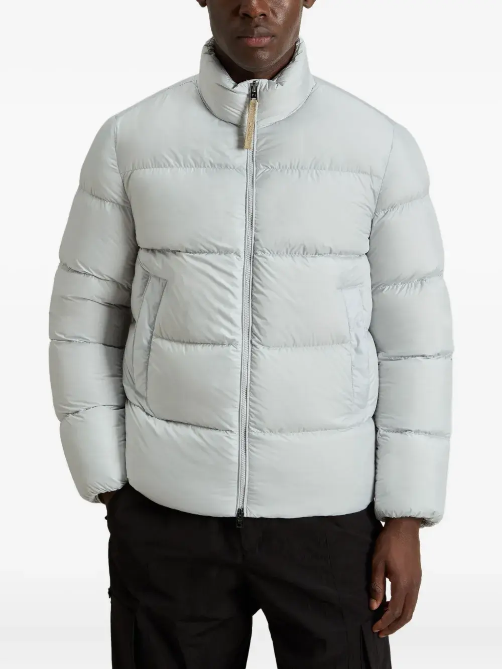 Светло-серый стеганый дизайн, застежка-молния, высокий ворот, прорезные карманы, шнурок на подоле