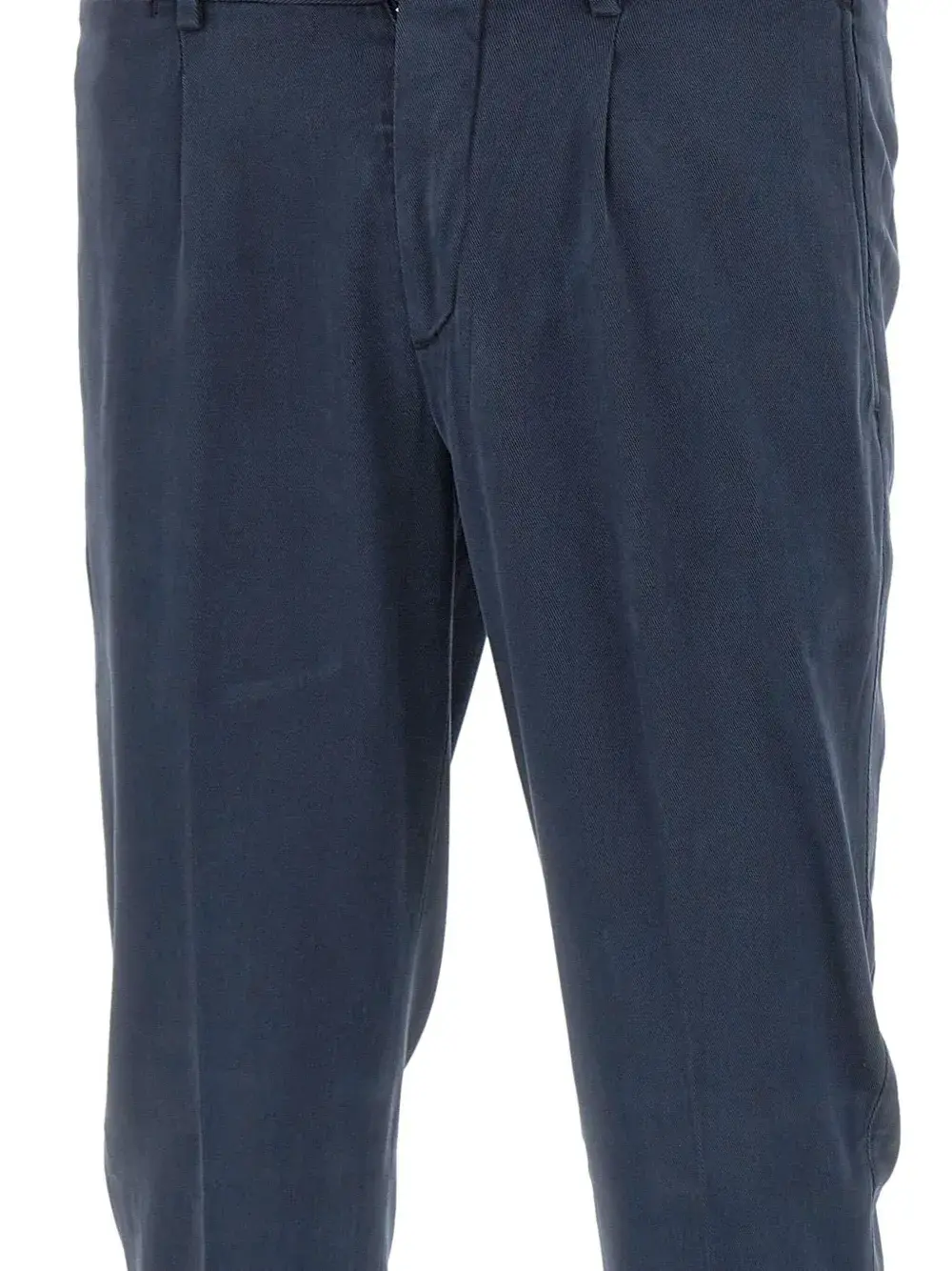 Темно-синие одинарные складки, боковые карманы с листочкой, шлевки для ремня, задние карманы, застежка на молнию и две пуговицы