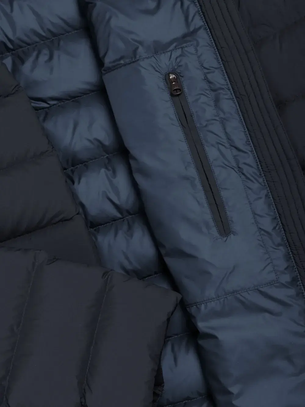 Темно-синяя стеганая отделка, капюшон, застежка-молния, боковые карманы, длинные рукава