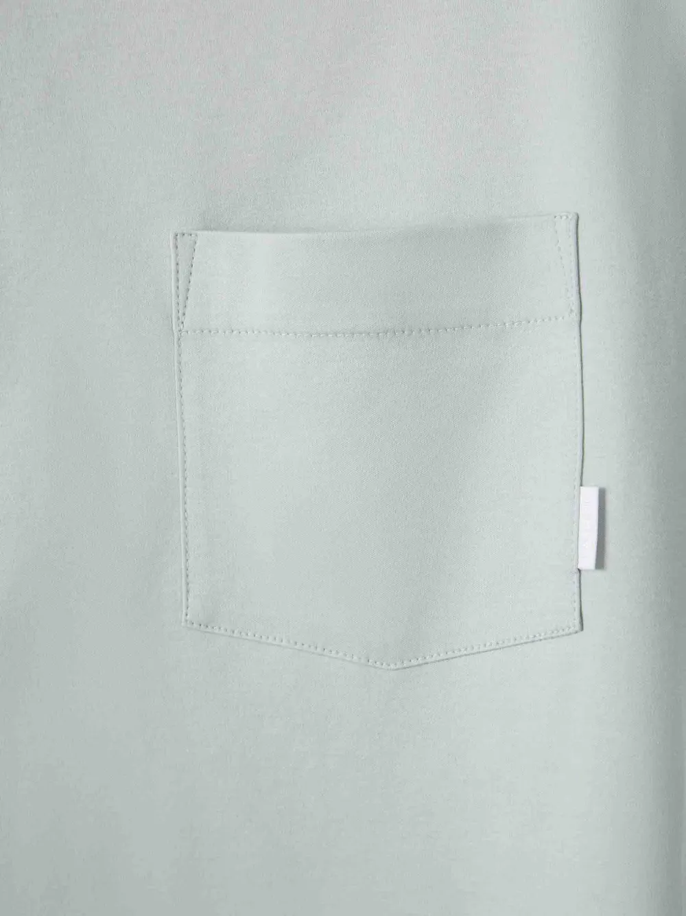 Синие короткие рукава, круглый вырез, нагрудный карман, отделка сверху