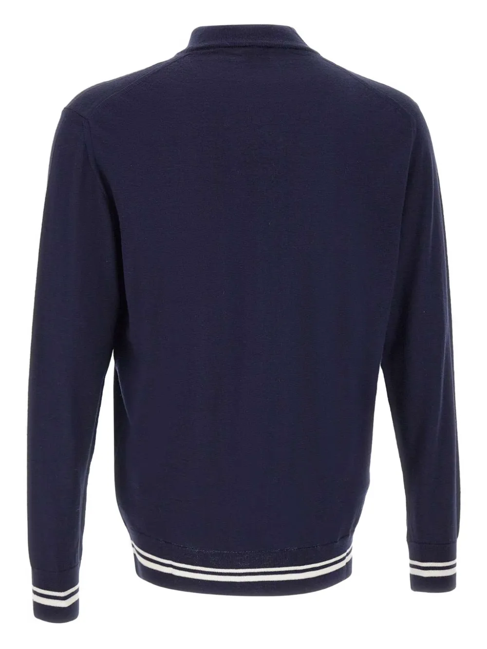 Темно-синяя застежка-молния с двумя бегунками, воротник-стойка, длинные рукава, ребристые манжеты, полосатый подол