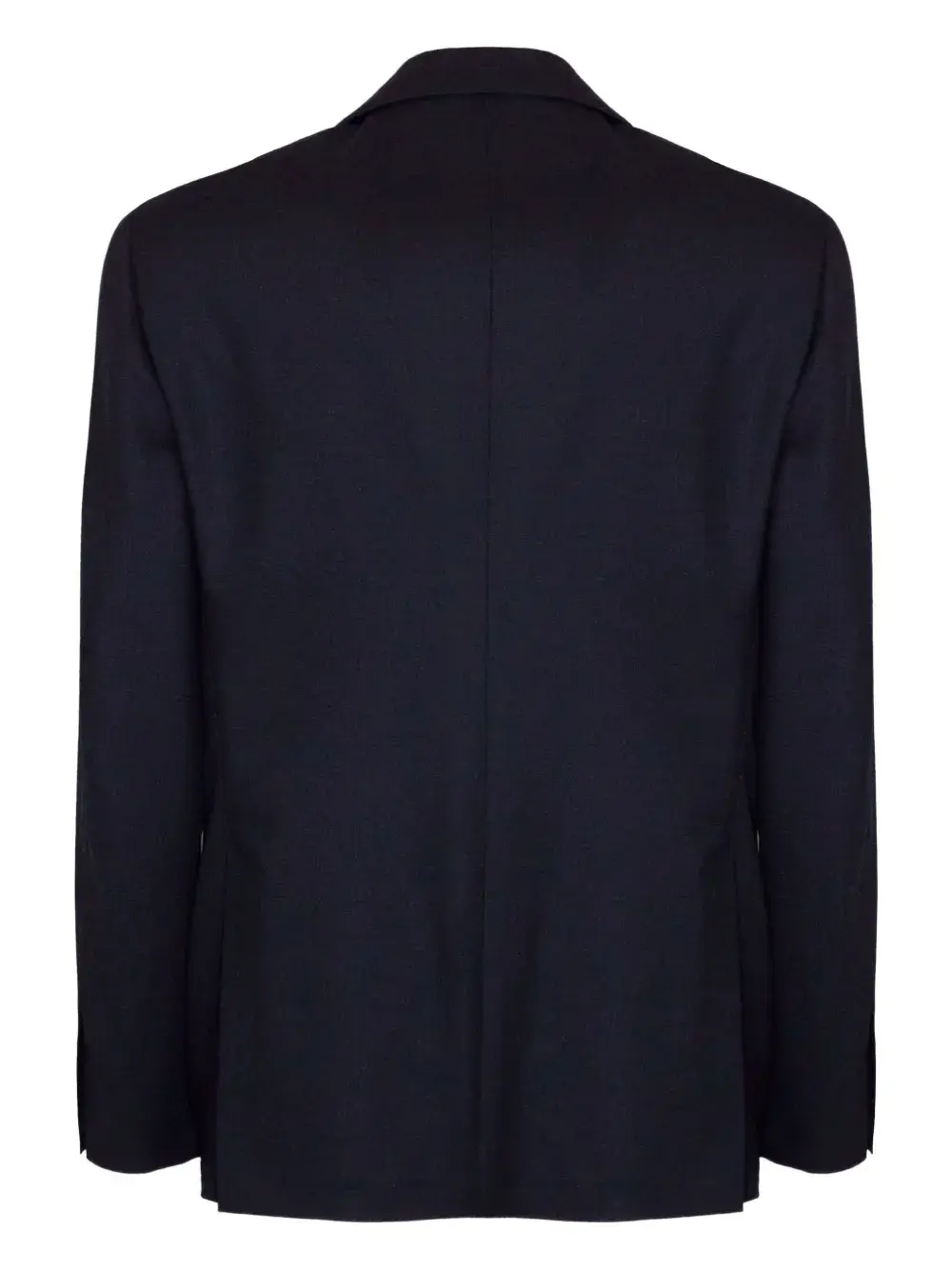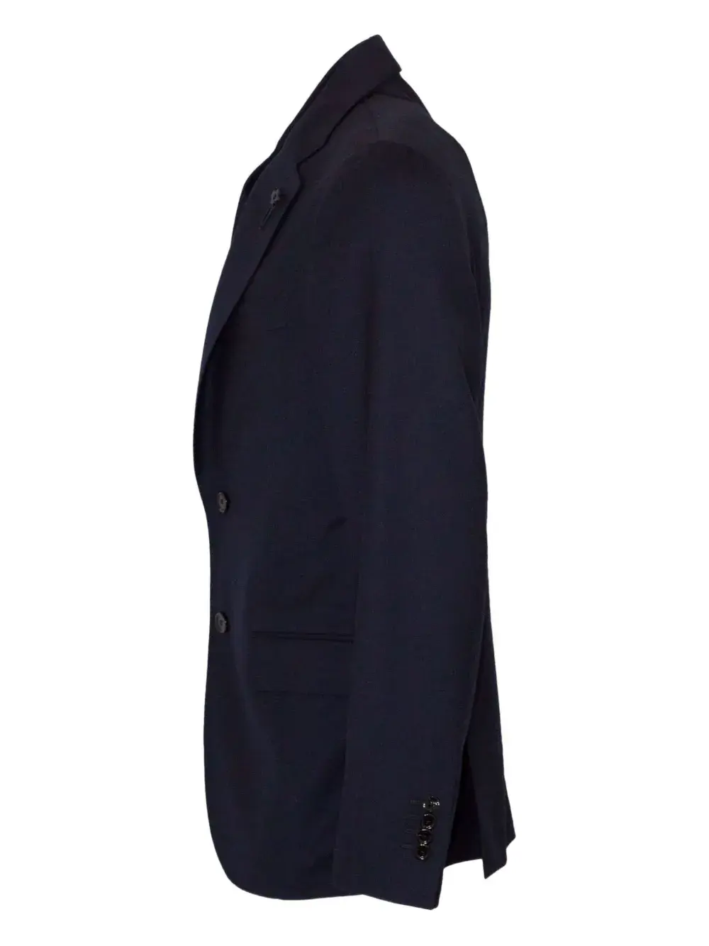 Синяя однобортная модель, застежка на две пуговицы, двойные боковые карманы, нагрудный карман, брошь, манжеты на пуговицах, шлица сзади