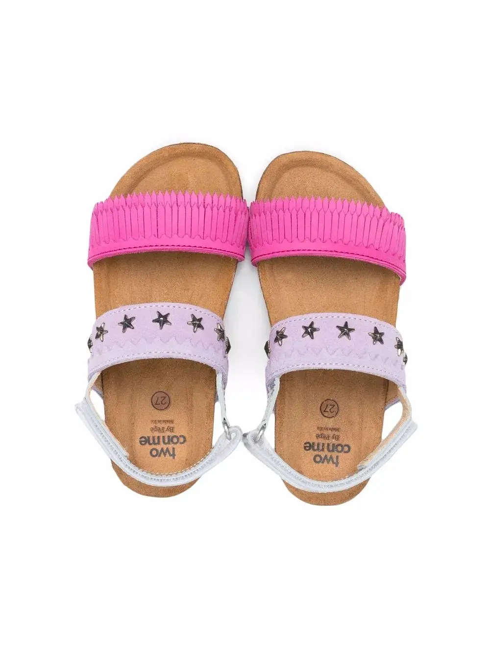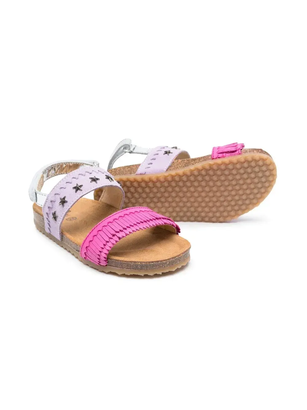 Сочетание двух оттенков, заклепки в форме звезд, бахрома, тональная строчка, открытый носок, ремешок на щиколотке с пряжкой, стелька с логотипом и плоская резиновая подошва.
