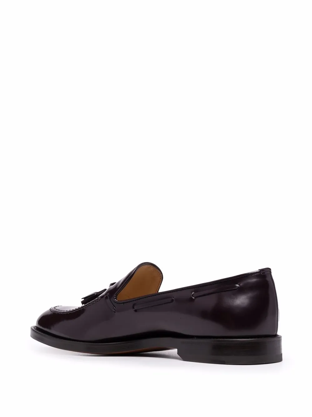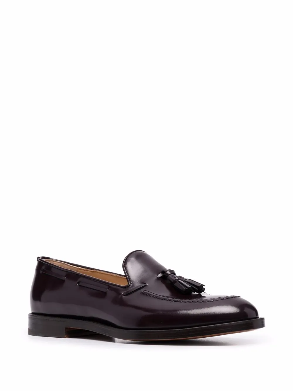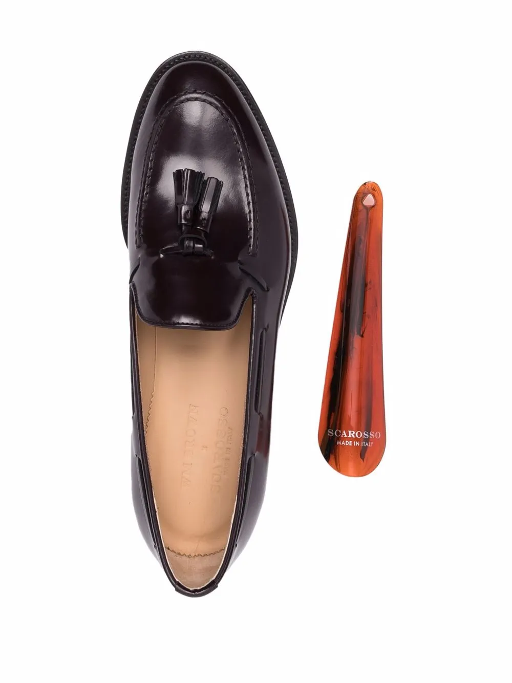Кожаная подкладка, декоративные кисточки, миндалевидный носок, модель без застежки, стелька с логотипом и низкий каблук.