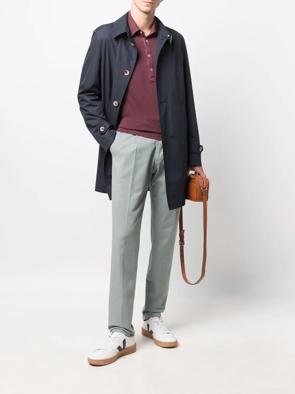 Ткань джерси, воротник поло, короткая застежка на пуговицах спереди, длинные рукава и прямой подол.
