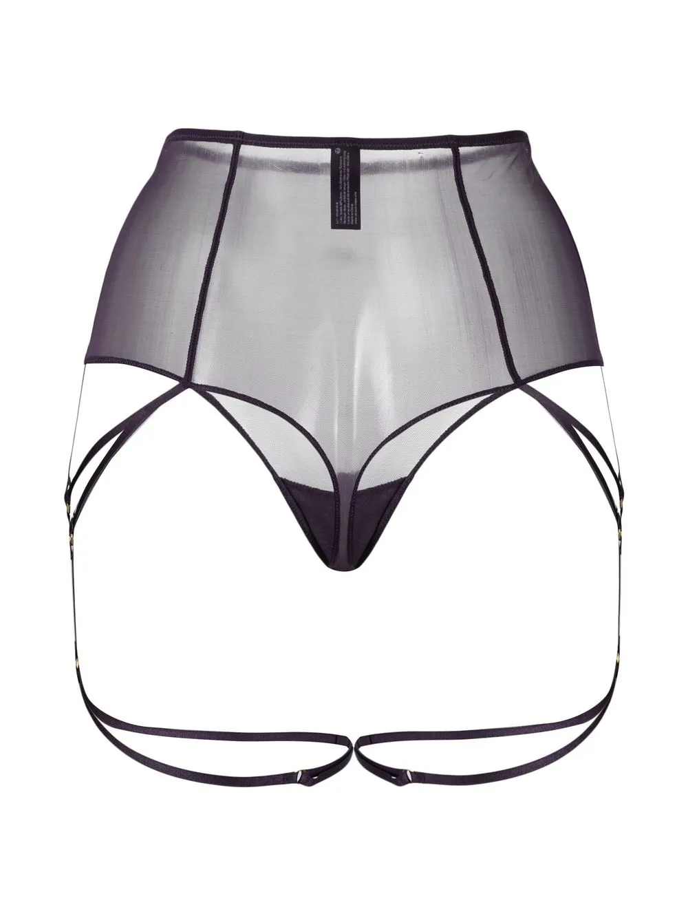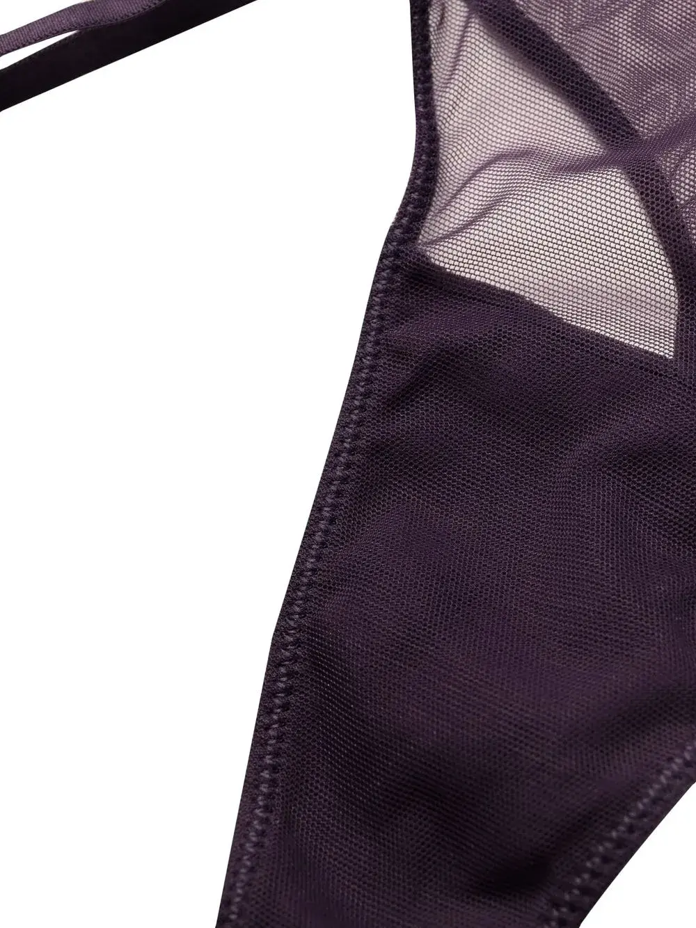 Фиолетовый, сетка, завышенная талия, прозрачный материал, эластичный пояс и Т-образный ремешок. Эту вещь можно примерить, но только поверх собственного белья.