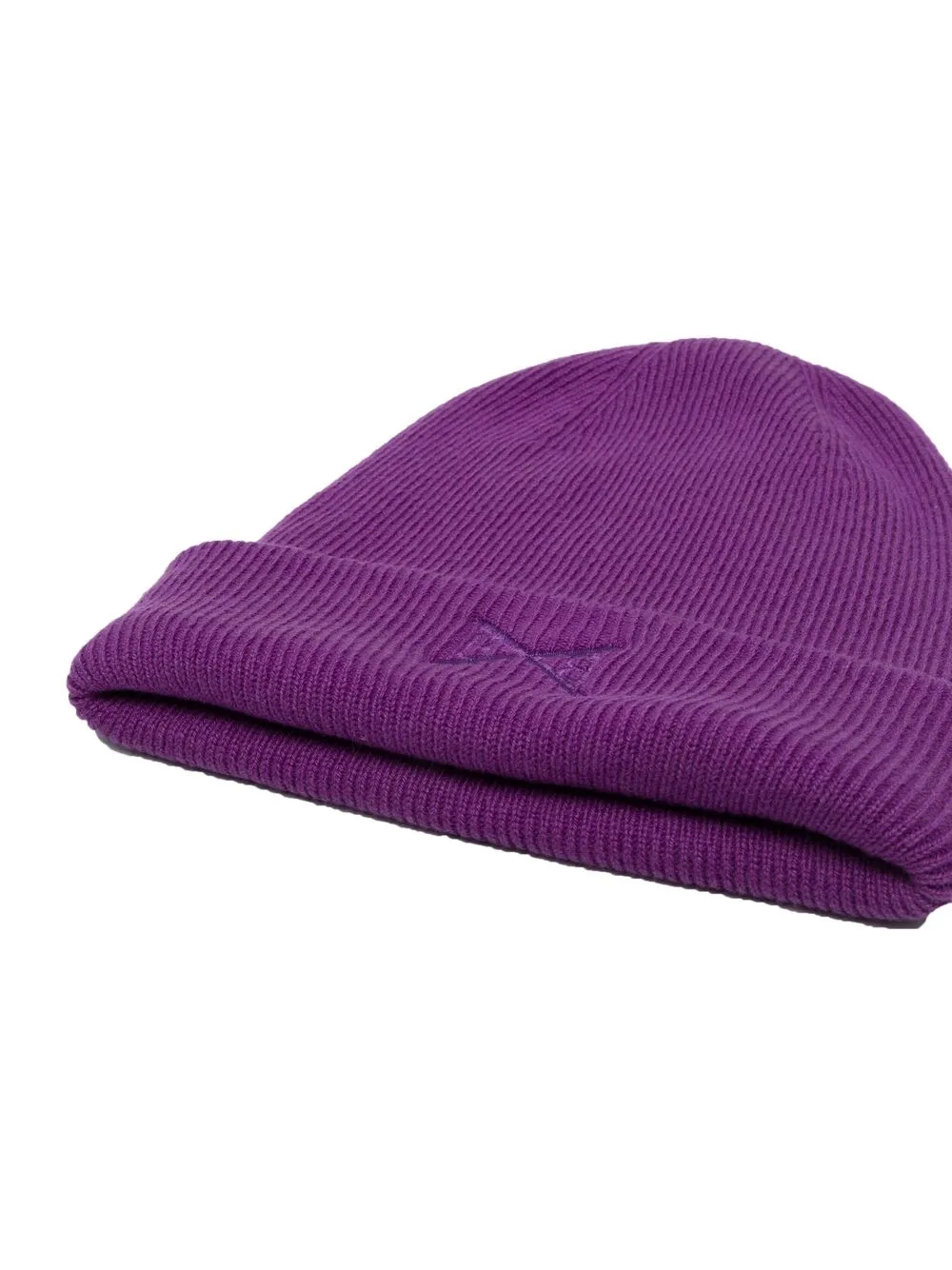 Фиолетовый, кашемир, трикотажный материал, вышитый логотип спереди и подвернутые поля.